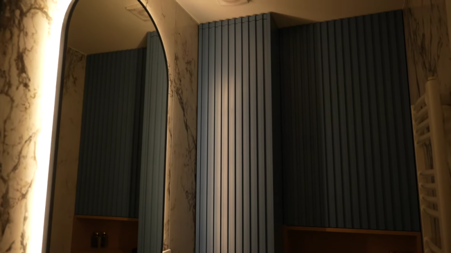 Posebno su zanimljivi detalji u dva kupatila, jedno manje i drugo veće, sa prelepom kadom i bež akcentima.