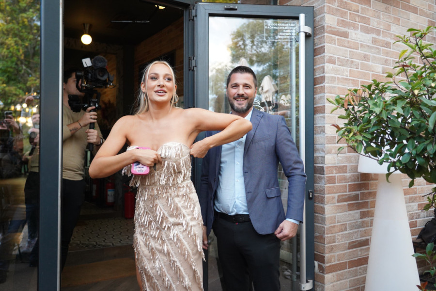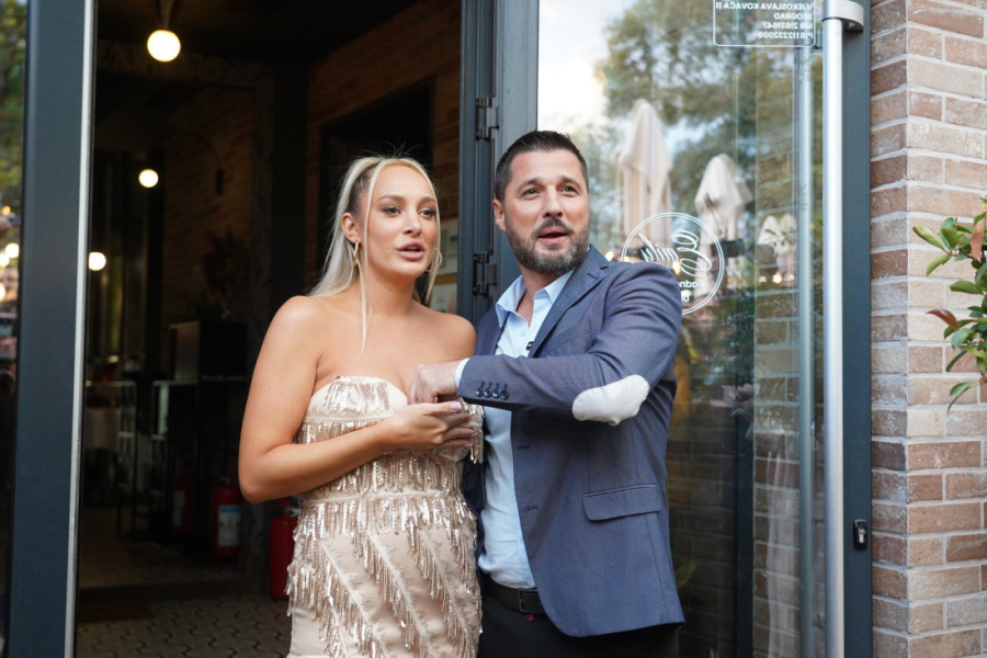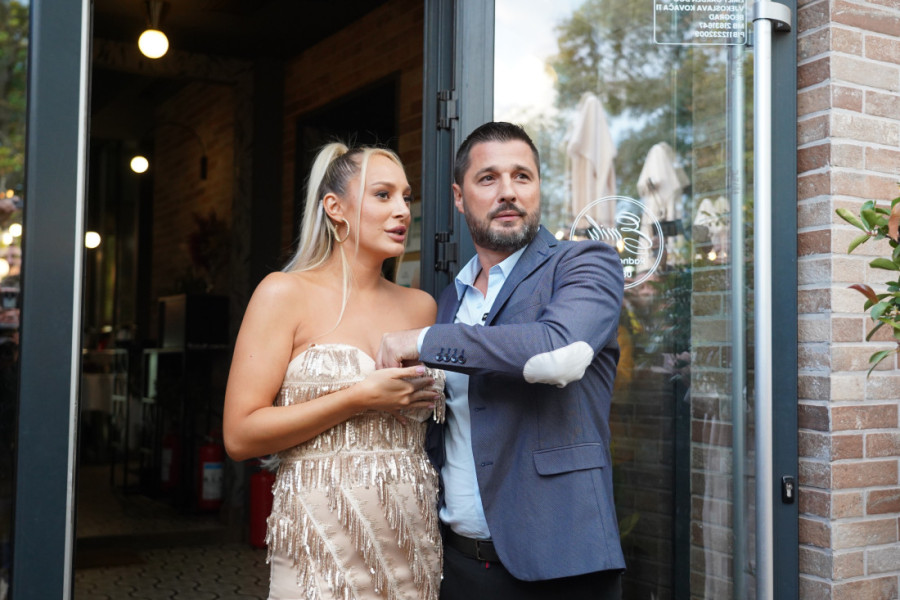 Ona je, naime, nosila veoma provokativnu haljinu zlatne boje sa resama, a pažnju su privukli duboki dekolte i gola noga. Međutim, u jednom trenutku je imala peh, a očekivano, muž Marko joj je priskočio u pomoć.