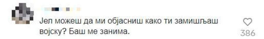 - Kada je objavljeno da će biti ponovo obavezan vojni rok, ljudi su masovno počeli da mi komentarišu video da jedva čekaju da me vide u vojsci. Ti videi koje sam ja objavljivao su bili šala na moj račun, iako su se ljudi uvredili misleći da ja ismevam vojsku i vojnike, ne daj Bože. Ja sve to podržavam; fizički sam spremniji od 90 odsto muškaraca u Srbiji... Verovatno bih poneo preparate za celu kasarnu, poneo bih dosta stvari - kazao je pevač za okupljene medije među kojima je bila i 24sedam.