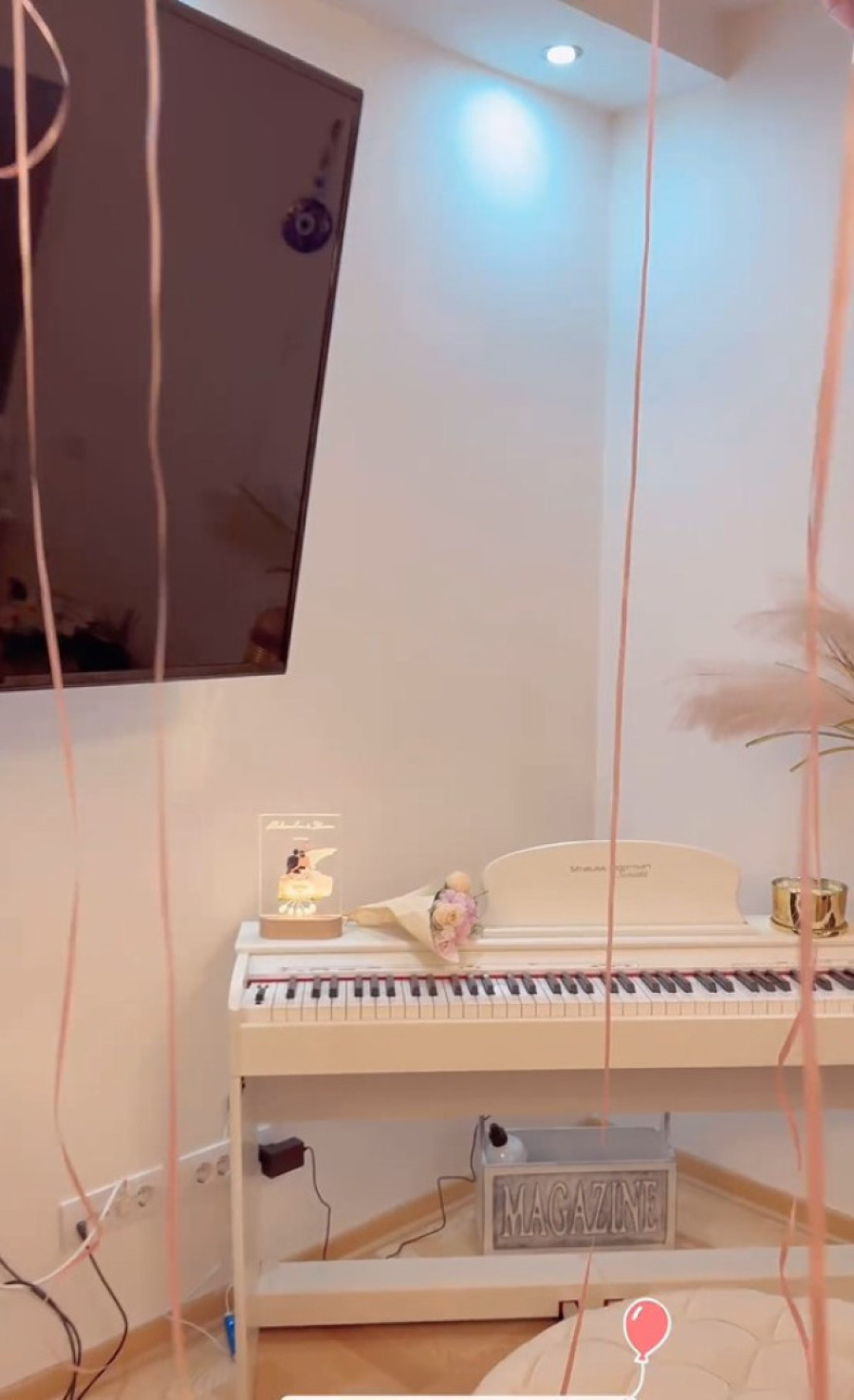 Kako su oboje muzičari, nije čudno što se u ćošku nalazi mali klavir, a svuda su različite sitnice - vaze, ramovi sa fotografijama, slike na zidovima i slično. Sa plafona vise dva velika lustera sa kristalima.