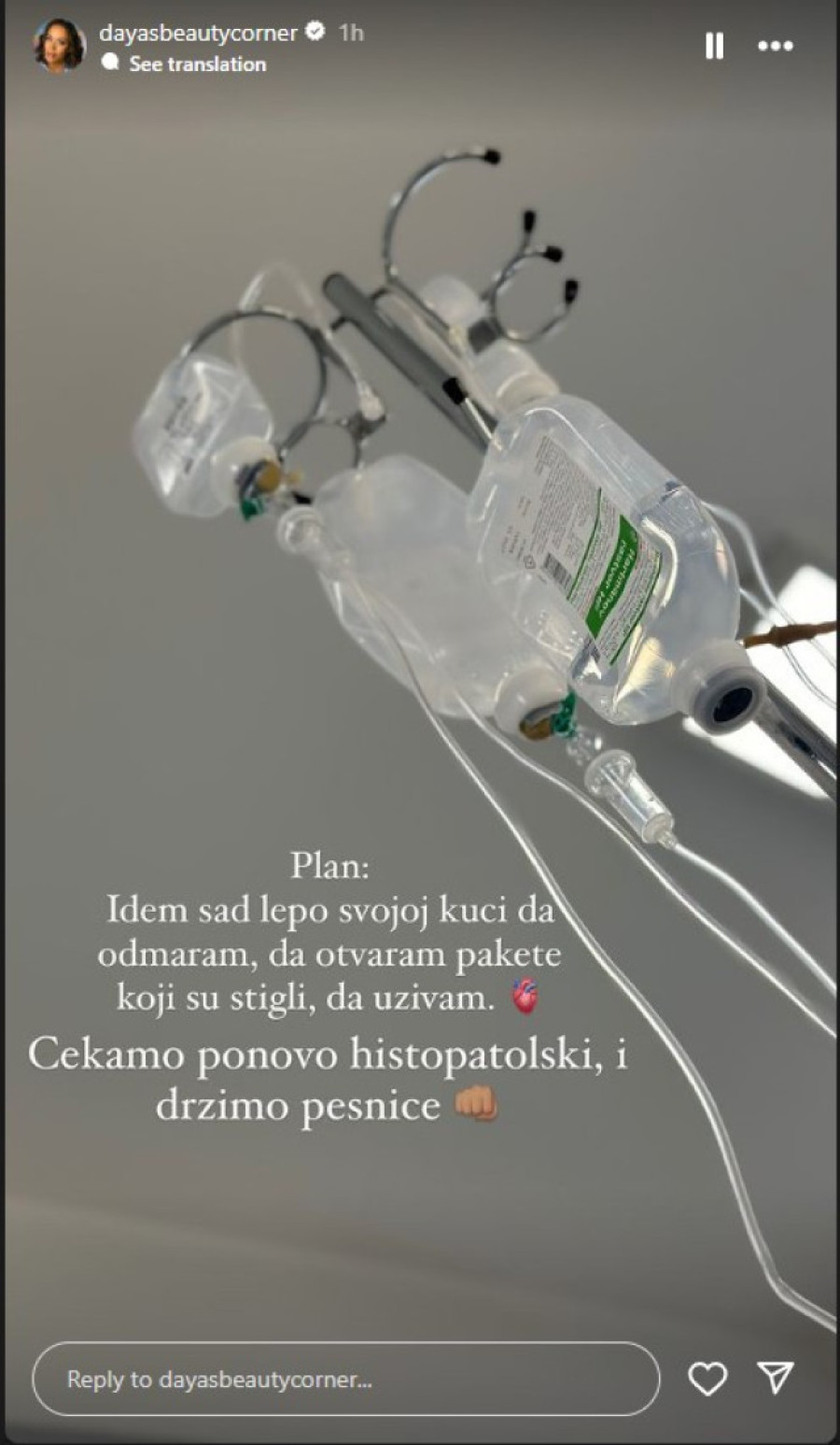 - Plan: Idem sad lepo svojoj kući da odmaram, da otvaram pakete koji su stigli, da uživam. Čekamo ponovo histopatološli i držimo pesnice.