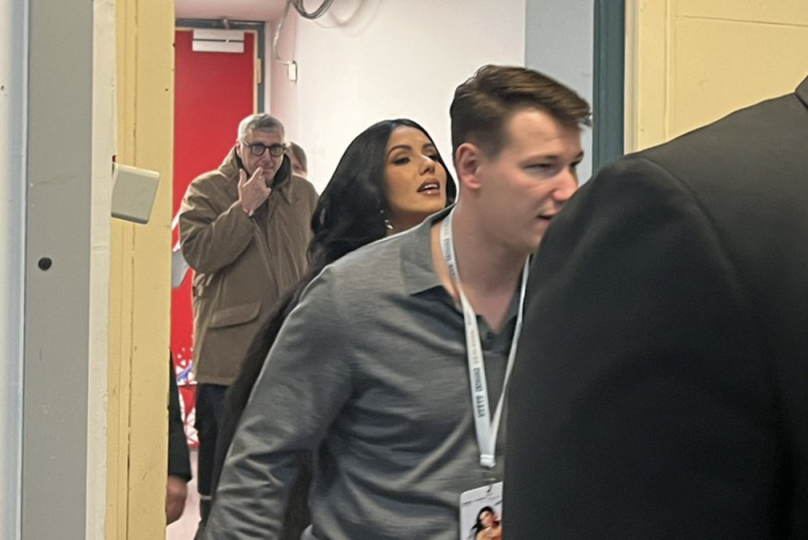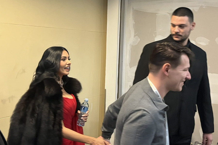 Blistajući u crvenoj kreaciji i sa bundom prebačenom preko ramena, pa s dijamantima oko vrata, posebnim tonom progovorila je i o izabraniku Mukiju Bešiću, koji joj je ne napušta stranu. Na konstataciju kako „sve drži pod kontrolom", prokomentarisala je: