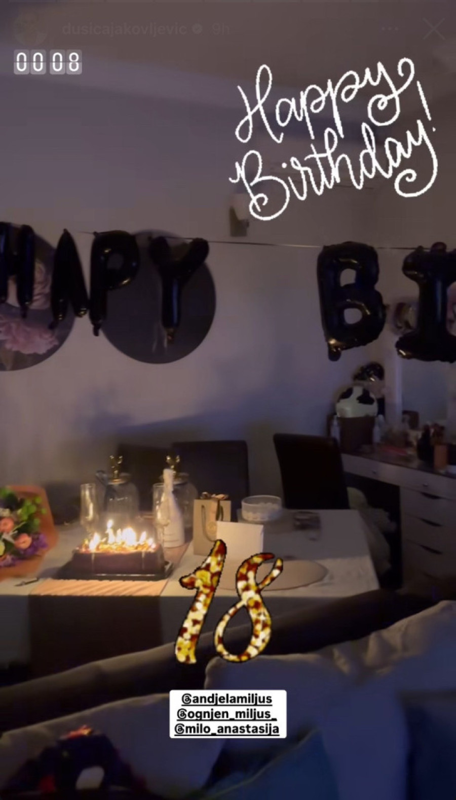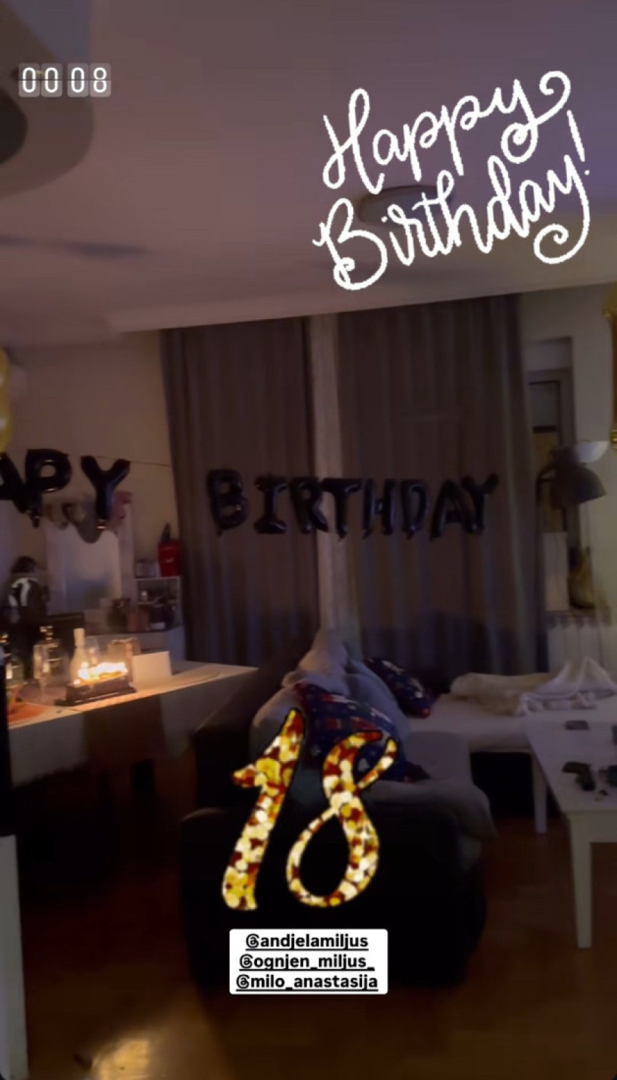 Kako se moglo videti, u prazničnom raspoloženju koje vlada u njenom domu, na stolu je bila postavljena torta sa svećicama, a okolo su bili baloni u obliku slova na kojima je pisalo “srećan rođendan”, a pored toga i baloni u obliku broja 18, koliko godina je Anđela napunila.