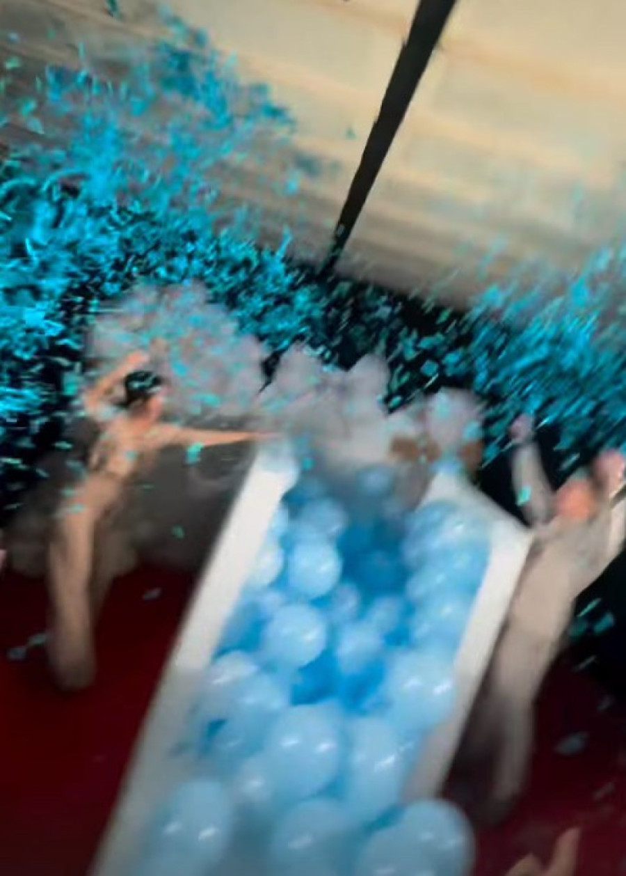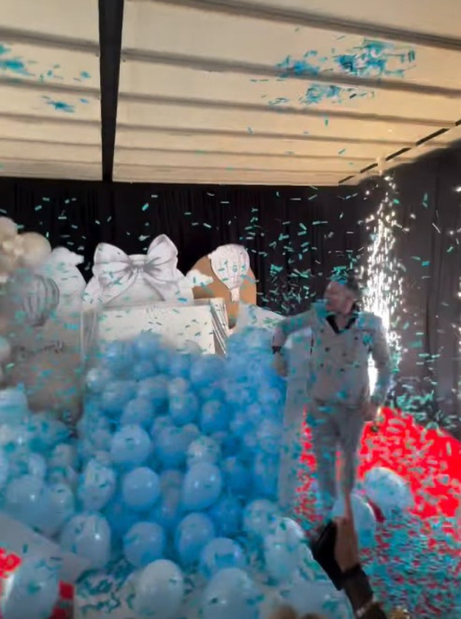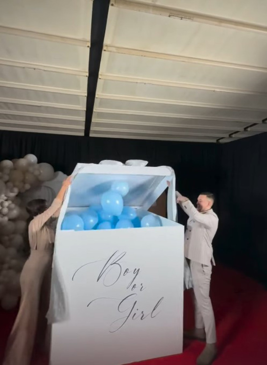 Par je stajao ispred ogromne kutije, kada su iz nje izleteli plavi baloni, što znači da će beba koju čekaju biti dečak.