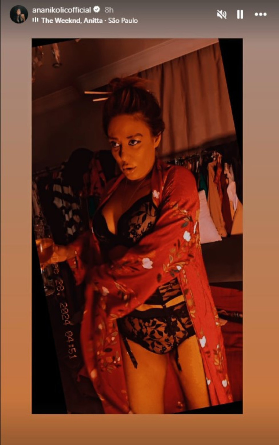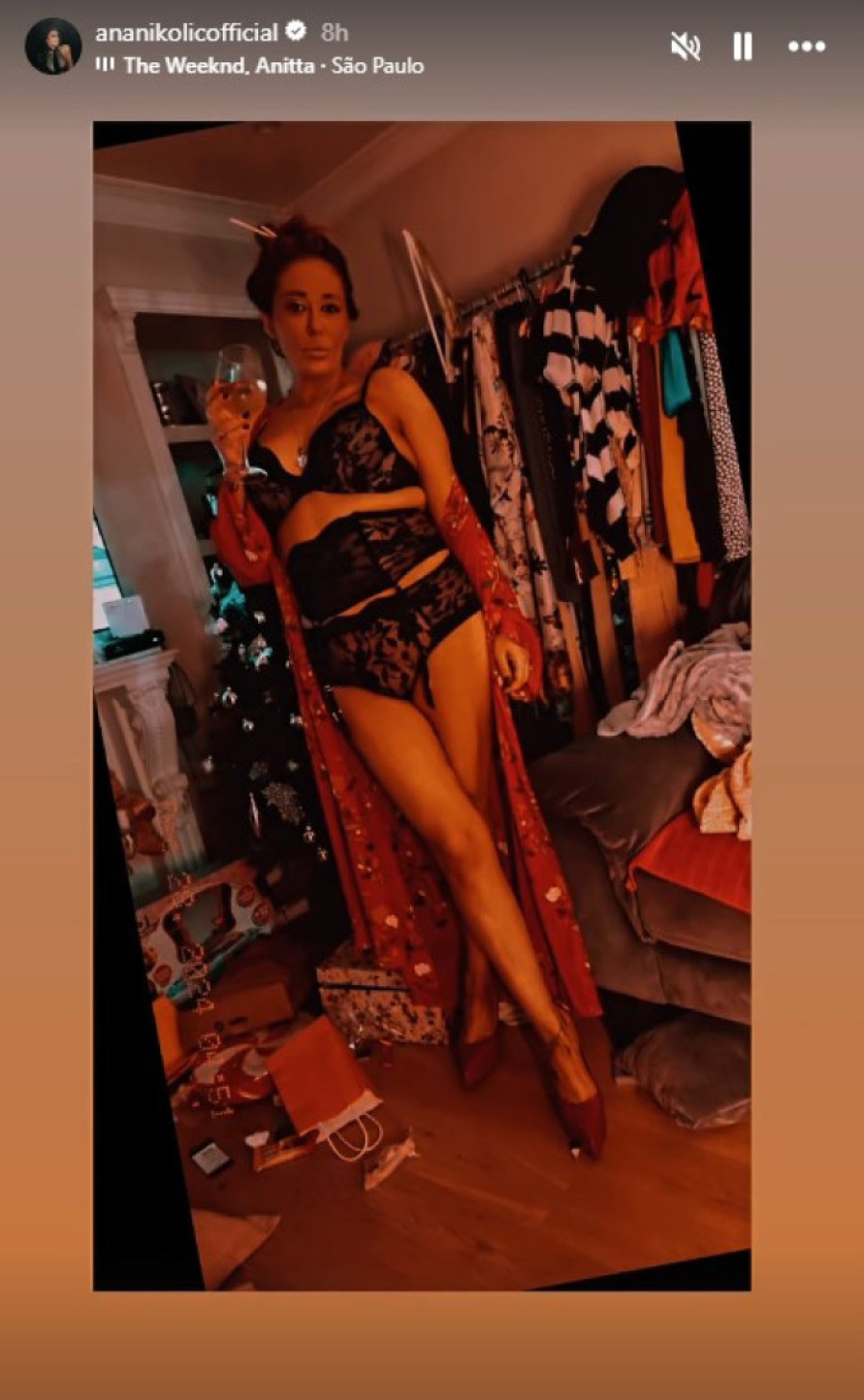 Ona je, naime, na svom nalogu na Instagramu objavila nekoliko fotografija u okviru storija, u kom je pozirala u čipkanom, crnom vešu, dok je preko nosila crveni bademantil sa sitnim detaljima, a na nogama crvene cipele na štiklu.