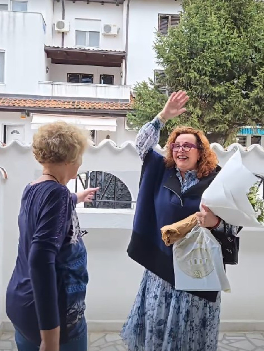 Bekuta je u rukama nosila cveće i kesu sa poklonom, ali joj to nije smetalo da se veseli uz zvuke trube dok se pozdravlja sa domaćinima.