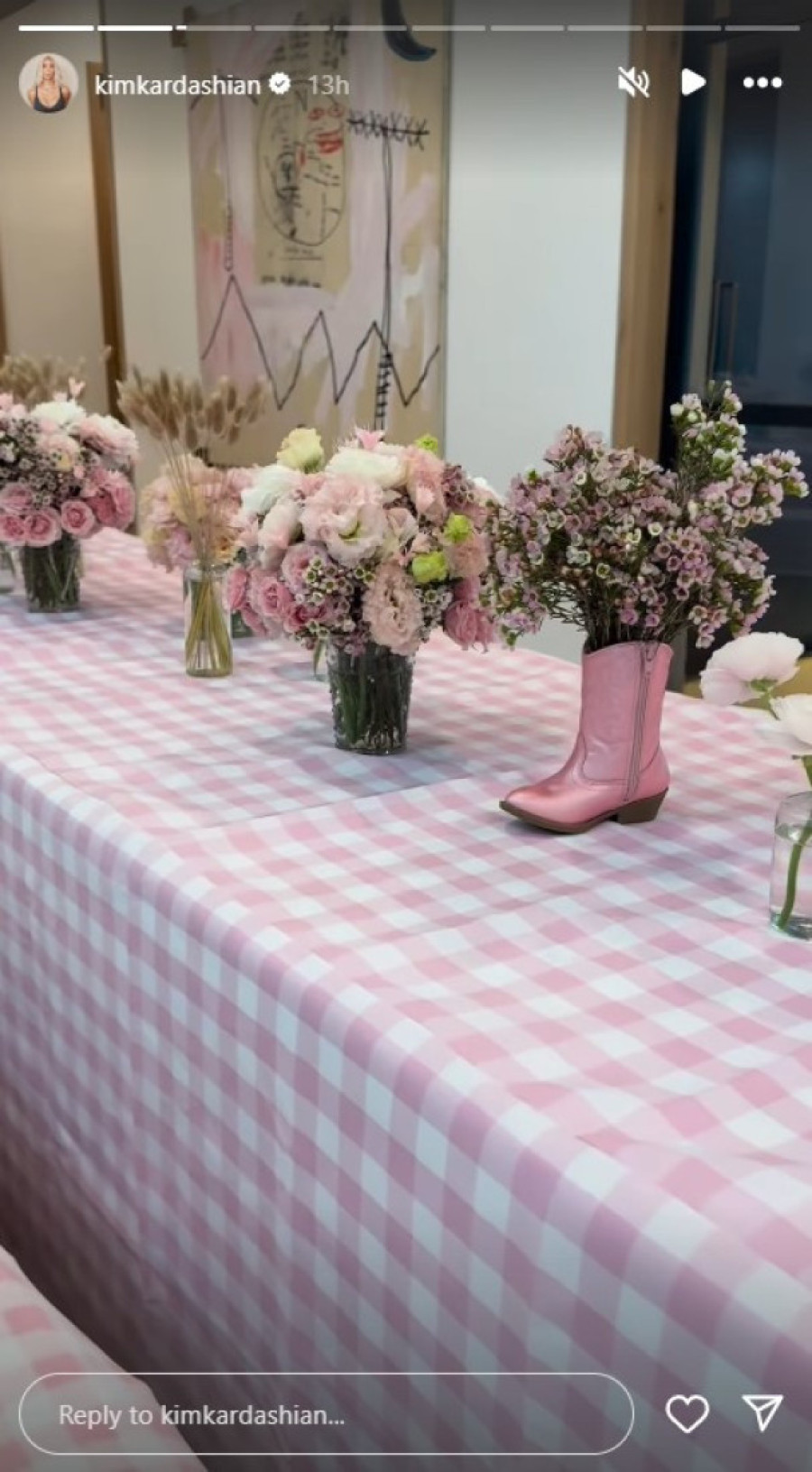 Kim je podelila video u kojem je pokazala pripreme za zabavu, snimajući dugi sto prekriven roze kariranim stolnjakom, kaubojskim čizmama i vazama sa belim i roze buketima, dok su gosti sedeli na senu.