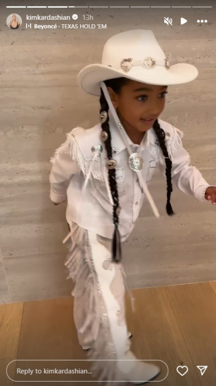 Čikago je bila obučena u belu košulju sa resama, imala je beli kaubojki šešir i bele pantalone sa resama, dok je Kim postavila snimak sa Čikago u tom autfitu, uz Bijonsinu pesmu "Texas Hold 'Em." Na leđima njene košulje, bilo je personalizovano ime "Chicago West" sa dijamantima i resama.
