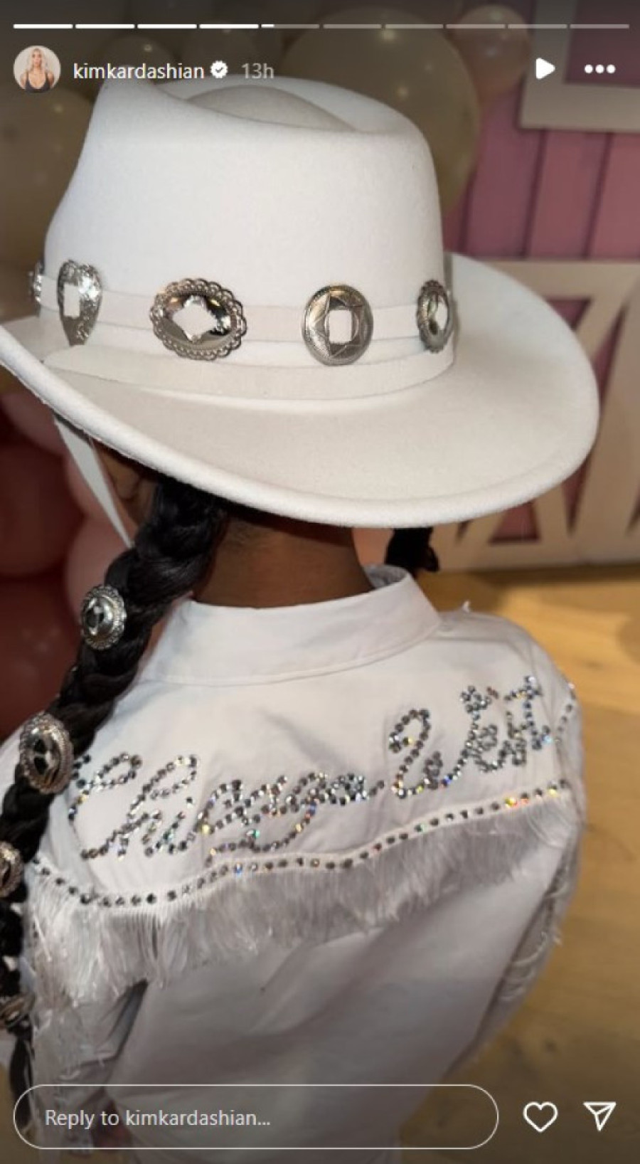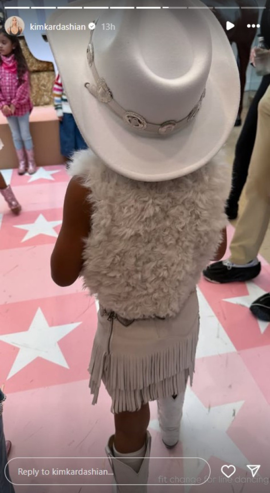Njen mlađi brat, Psalm (5), nosio je kariranu košulju i kožni prsluk, dok je pozirao sa rođakom Tatumom (2), sinom Kimine sestre Kloi. Kim je nosila crnu kožnu kombinaciju, sa kaubojskim šeširom, otkopčanom košuljom, zapadnjačkim kaišem i farmerkama, dok je pozirala za seriju selfija ispred ogledala.