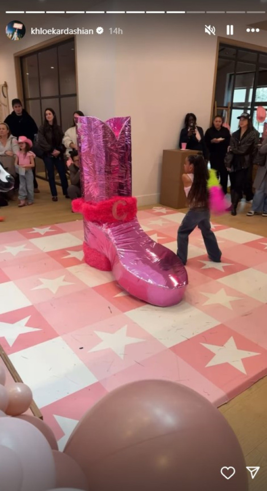 Kloi je takođe podelila atmosferu, snimivši video svog sina Tatuma, ćerke Tru (6) i Čikago, kako plešu na roze i belom plesnom podijumu pored personalizovane bine, ukrašene figurama krava i konja, balvanima sena, pastelnim balonima i ogromnim ružičastim slovima "Chi".