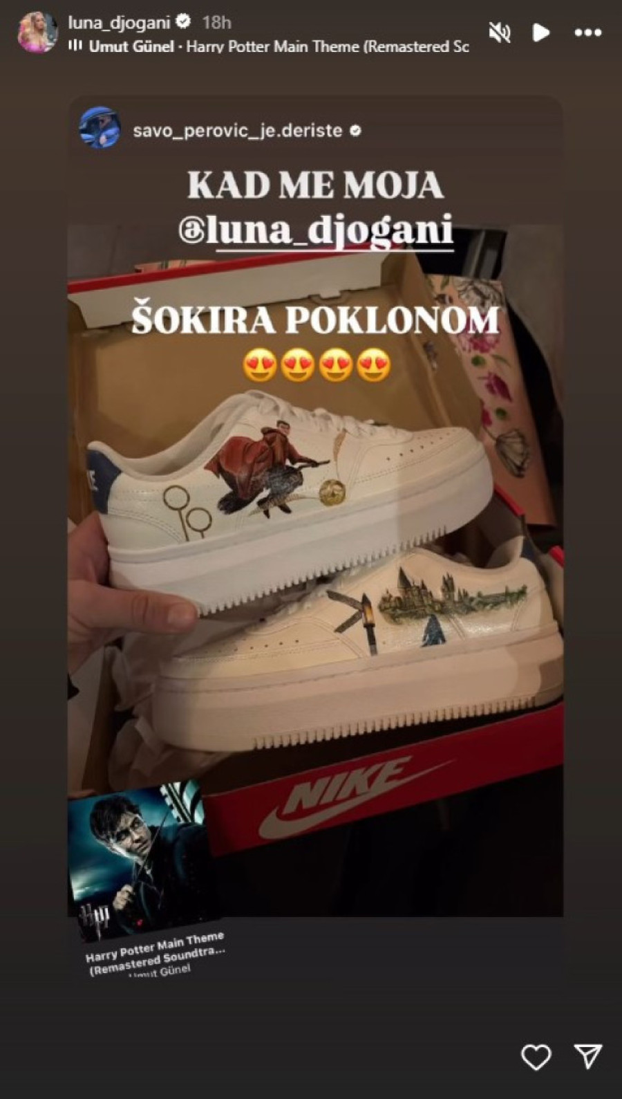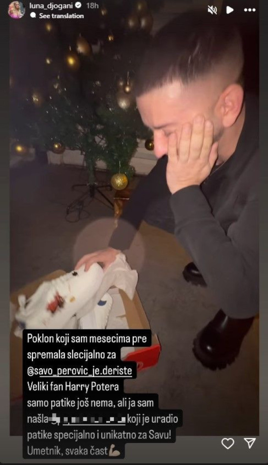 - Poklon koji sam mesecima pre spremala specijalno za Savu Perovića. Veliki fan Harija Potera samo patike još nema, ali ja sam našla nekog ko je uradio patike specijalno i unikatno za Savu - napisala je Luna uz video na kom je prikazala kakva je bila Perovićeva rekacija kada je otvarao poklon.
