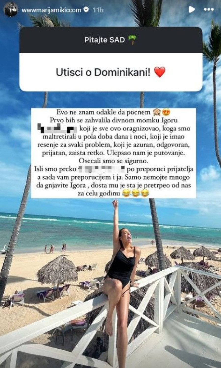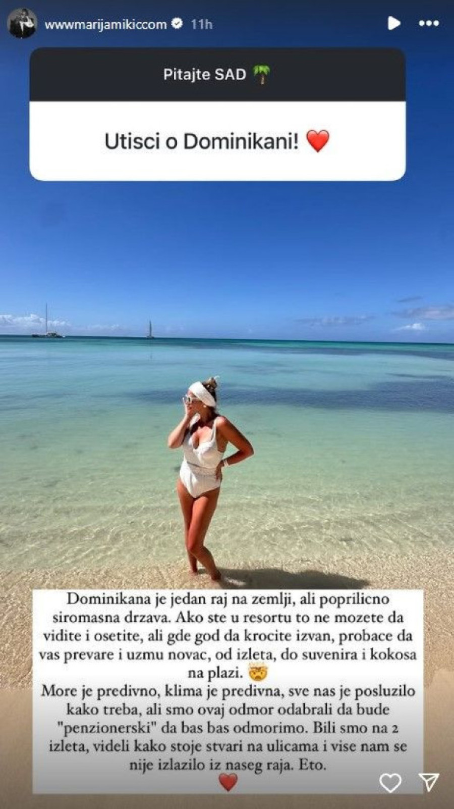 - Dominikana je jedan raj na zemlji, ali poprilično siromašna država. Ako ste u rizortu to ne možete da vidite i osetite, ali gde god da kročite izvan, probaće da vas prevare i uzmu novac od izleta, suvenira i kokosa na plaži - počela je Marija na svom Instagramu, a potom dodala:
