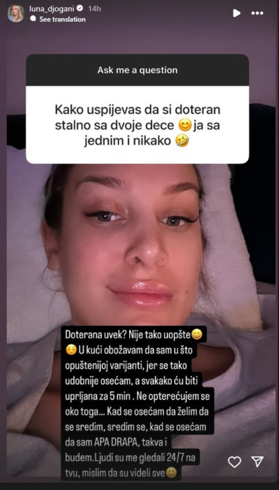 - U kući obožavam da sam u što opuštenijoj varijanti, jer se tako udobnije osećam, a svakako ću biti uprljana za pet minuta. Ne opterećujem se oko toga. Kad se osećam da želim da se sredim, sredim se, kad se osećam da sam apa drapa, takva i bude. Ljudi su me gledali 24 kroz sedam na televiziji, mislim da su videli sve - poručila je Luna.