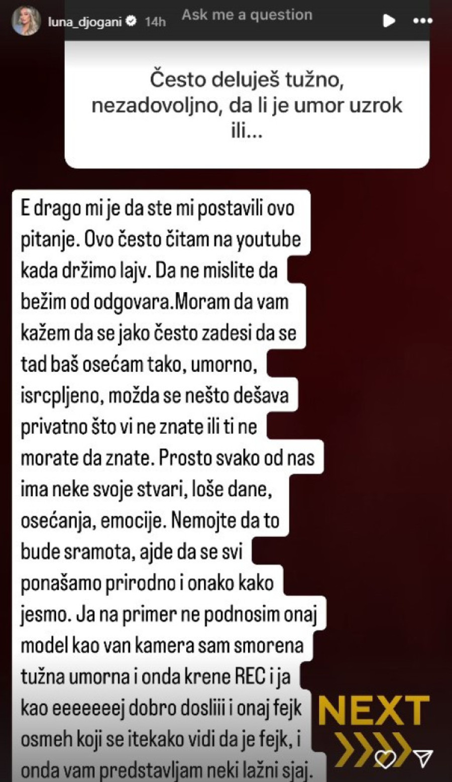 - Drago mi je što ste me to pitali, ovo često čitam kad držimo lajv. Moram da vam kažem da se jako često zadesi da se tad baš osećam tako, umorno, iscrpljeno, možda se nešto dešava privatno što vi ne znate ili ne morate da znate. Prosto, svako od nas ima neke svoje stvari, loše dane, osećanja, emocije. Nemojte da to bude sramota. Ne podnosim onaj model kao, van kamera sam smorena, tužna, umorna, a onda krene snimanje i ja kao fejk osmeh, koji se vidi - rekla je Luna i dodala: