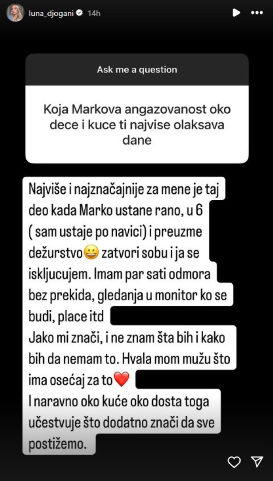 - Najviše i najznačajnije za mene je taj deo kada Marko ustane rano, u šest, sam ustaje po navici, i prezume dežurstvo. Zatvori sobu i ja se isključujem. Imam par sati odmora bez prekida, gledanja u monitor ko se budi, plače i tako dalje. Jako mi znači i ne znam šta bih i kako bih da nemam to. Hvala mom mužu što ima osećaj za to. I naravno oko kuće dosta toga učestvuje, što dodatno znači da sve postižemo - kaže ona, a priznala je i da je bila besna zbog nespavanja:
