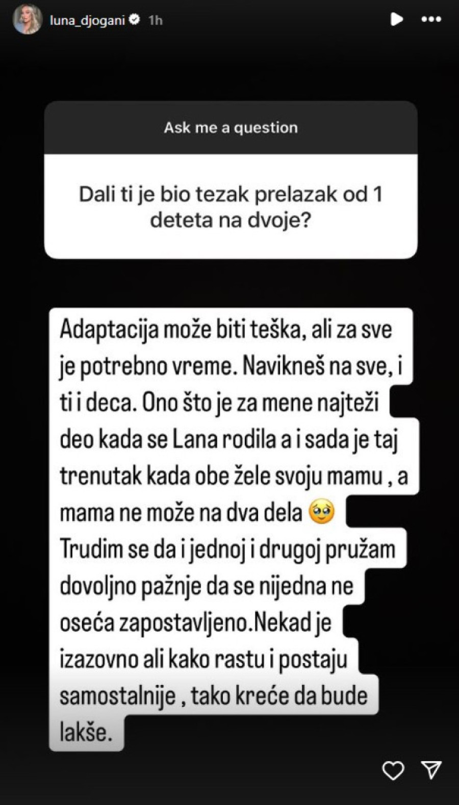 Šta je još Luna rekla o vremenu koje sama provodi sa Markom i šta joj je najteže palo kada je dobila drugo dete, pročitajte u galeriji iznad.