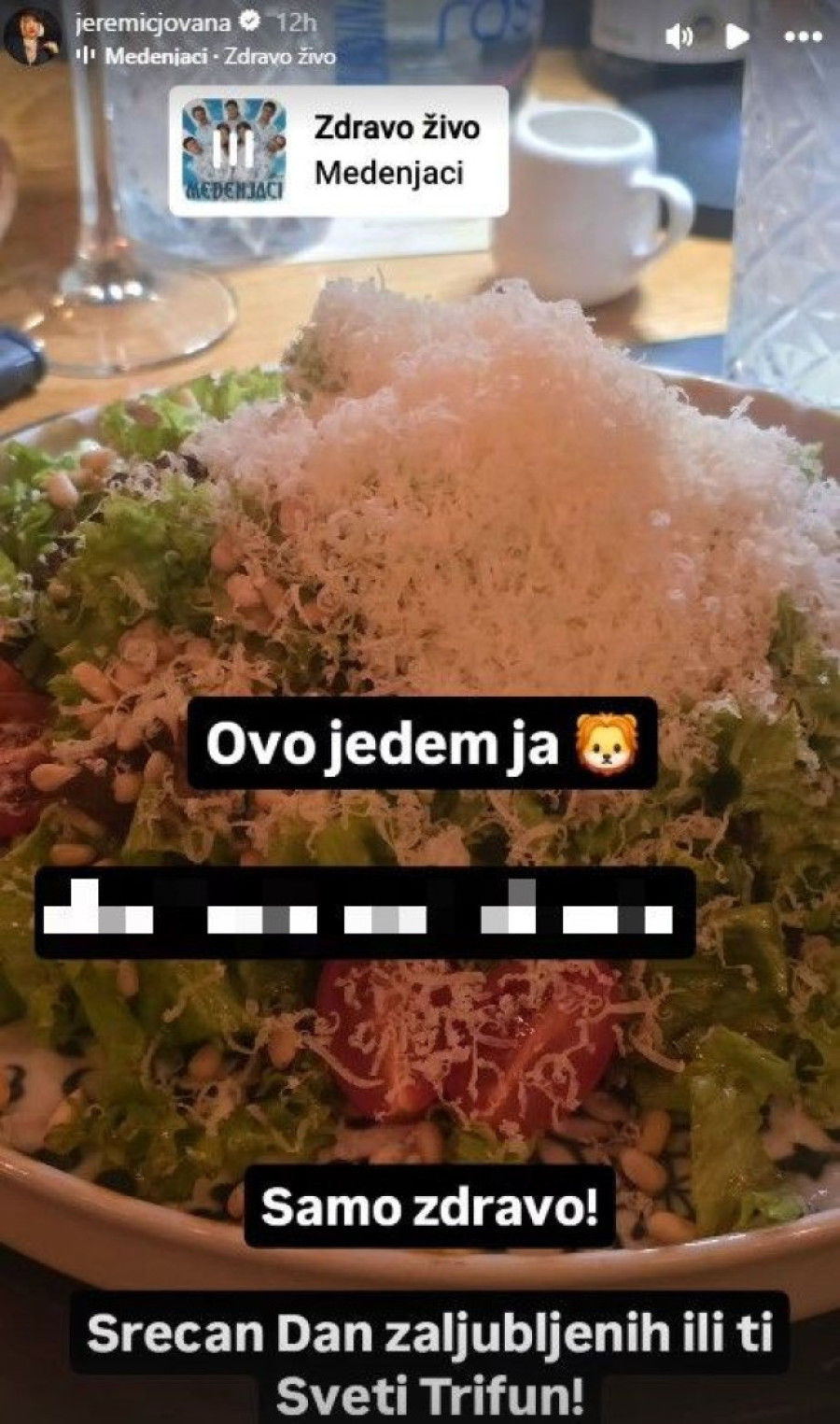 - Ovo jedem ja. Samo zdravo. Srećan Dan zaljubljenih, iliti Sveti Trifun - istakla je Jeremićeva u svojim „storijima", koja je već izvesno vreme na posebnom režimu i vrlo pazi na svoju liniju.