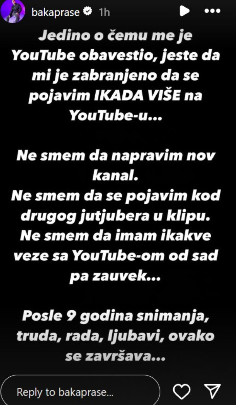 - Jutjub me je obavestio da mi je zabranjeno da se pojavim ikada više na Jutjubu. Ne smem da napravim nov kanal. Ne smem da se pojavim kod drugog jutjubera u klipu. Ne smem da imam ikakve veze sa Jutjubom od sad pa zauvek. Posle devet godina snimanja, truda, rada, ljubavi, ovako se završava.