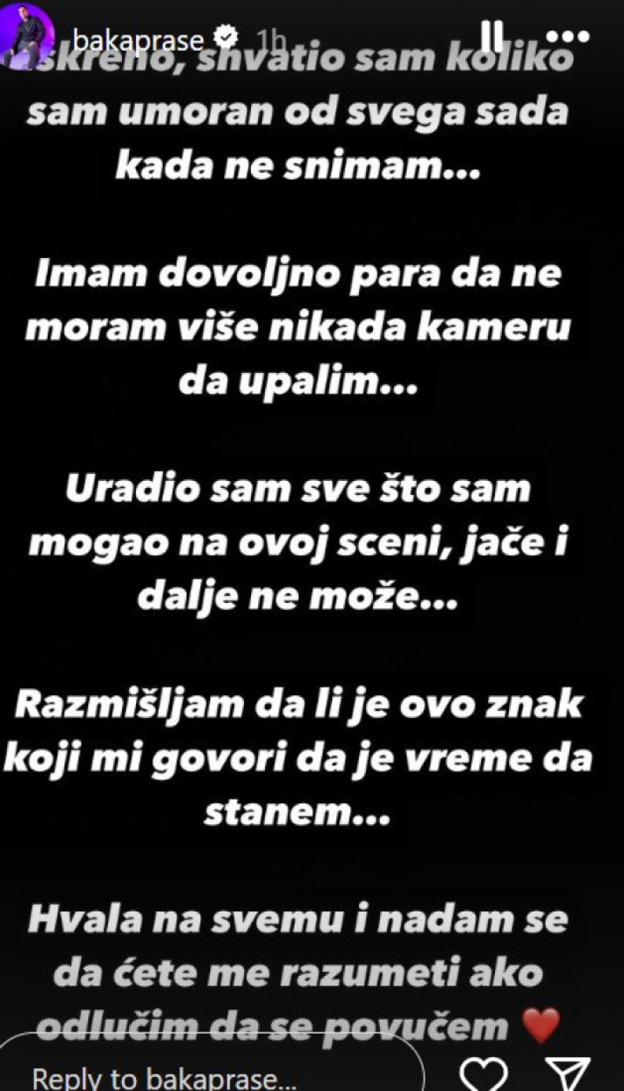 - Iskreno shvatio sam sad koliko sam umoran od svega sad kad ne snimam. Imam dovoljno para da ne moram više nikada kameru da upalim. Uradio sam sve što sam mogao na ovoj sceni, jače i dalje ne mogu. Razmišljam, da li je ovo znak koji mi govori da stanem. Hvala vam na svemu i nadam se da ćete me razumeti, ako se povučem - napisao je Baka Prase na Instagramu.