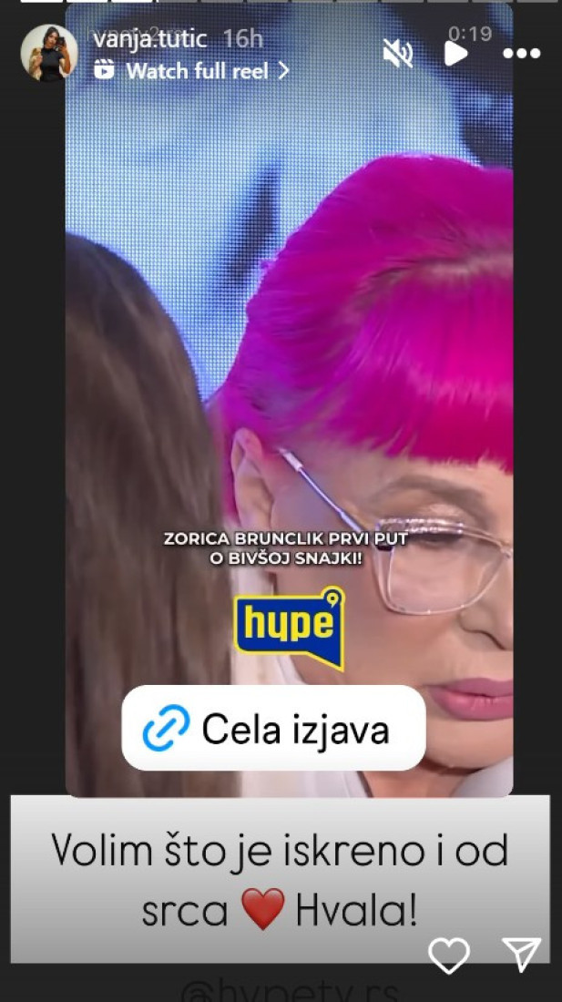 Nakon Zoričinog oglašavanja, Vanja je odlučila da se oglasi putem društvene mreže Instagram, te je nakon svih prozivki koje je iznela u emisiji, odlučila da se zahvali bivšoj svekrvi.