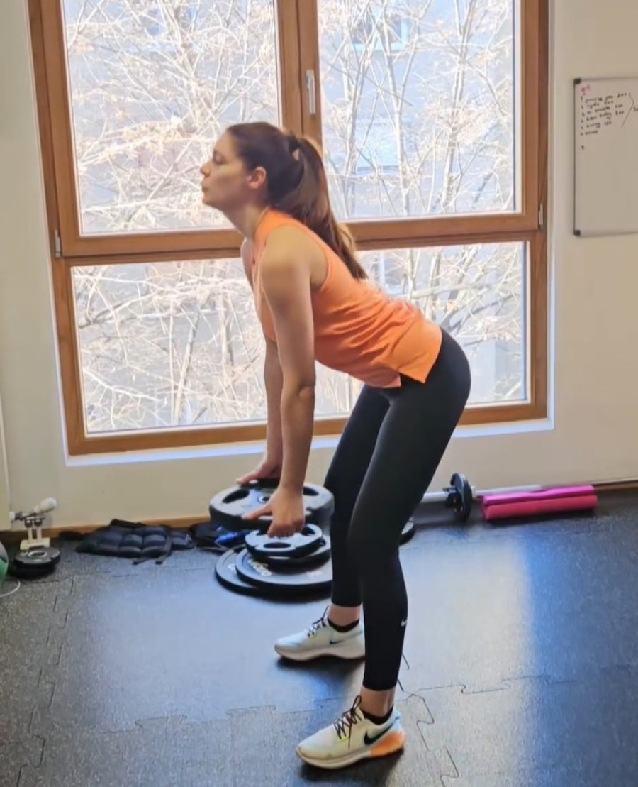 Ona se snimila kako radi čučnjeve koji pogađaju zadnju ložu i jačaju noge, a zatim i vežbu sa loptom za pilates koja najviše pogađa i jača trbušne mišiće.