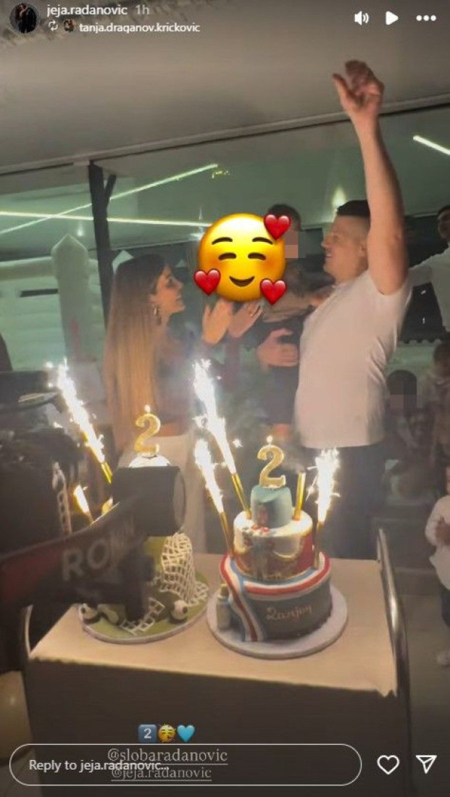 Jelena i Sloba Radanović organizovali su raskošno slavlje povodom drugog rođendana sina Damjana. Brojni prijatelji i članovi porodica rado su im se pridružili na istom, s izuzetkom pevačeve majke koja je, kako je i on sam kazao za medije u jednom momentu, prehlađena.