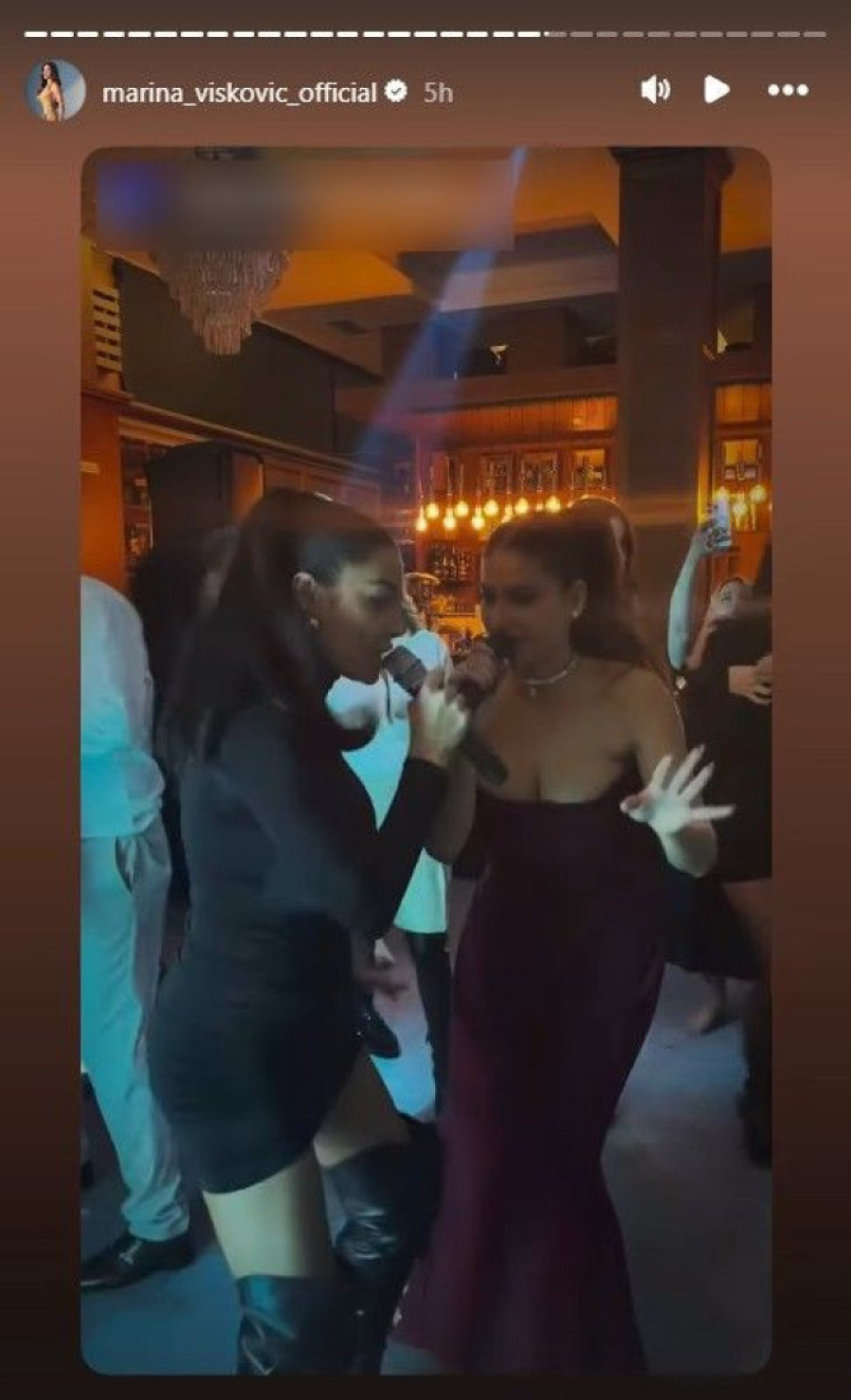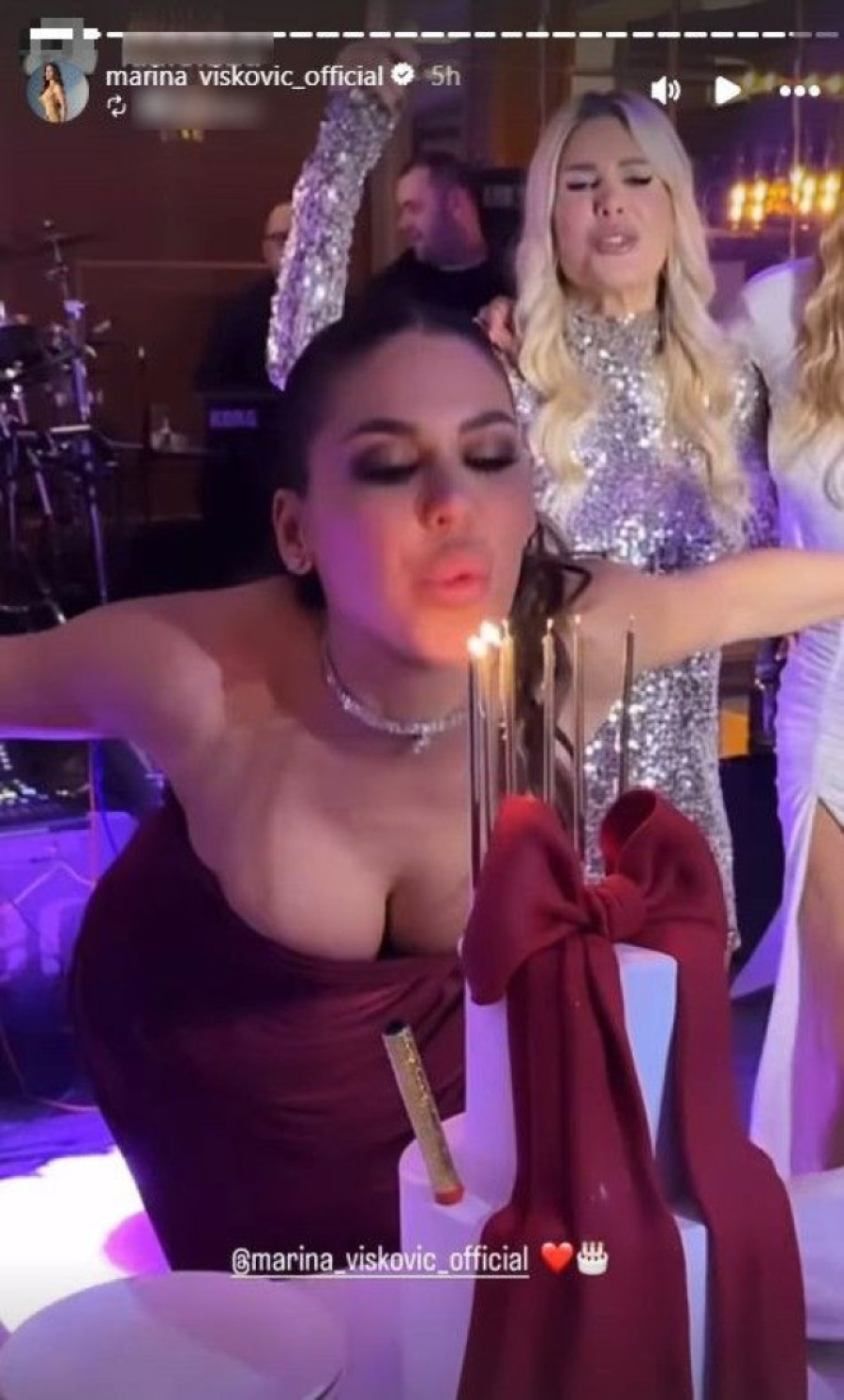 Na društvenim mrežama su se brzo pojavili snimci koji su otkrili delić magične atmosfere sa zabave. Slavljenica je blistala u prelepoj bordo haljini koja se prostirala do poda, dok je prednji deo haljine bio ukrašen korsetom, koji je sa lakoćom istakao Marinin zanosan izgled.