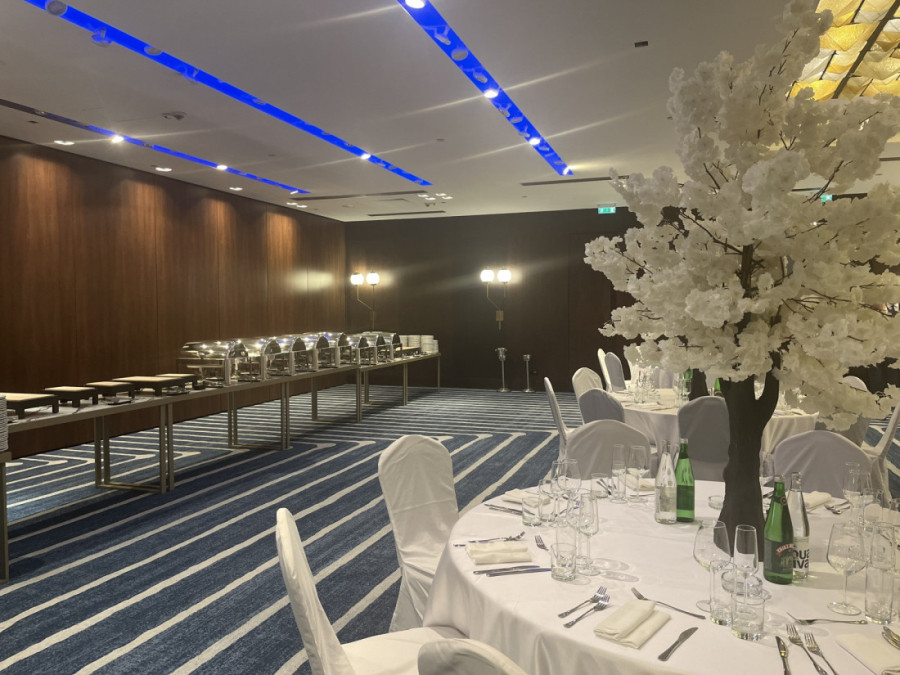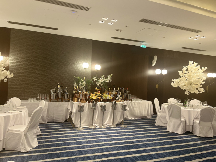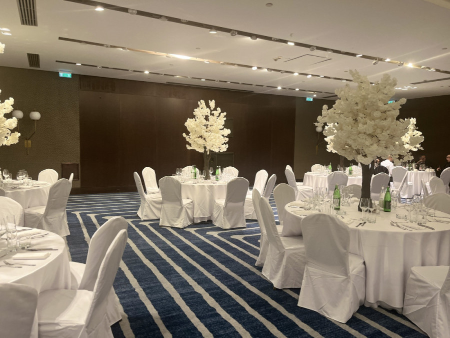 Bela boja dominira u dekoraciji, pa su tako stolovi i stolice prekriveni platnom u toj boji. Na svakom stolu se nalazi pravo malo drvo sa belim lišćem, što do sada nije viđeno na ovim prostorima.