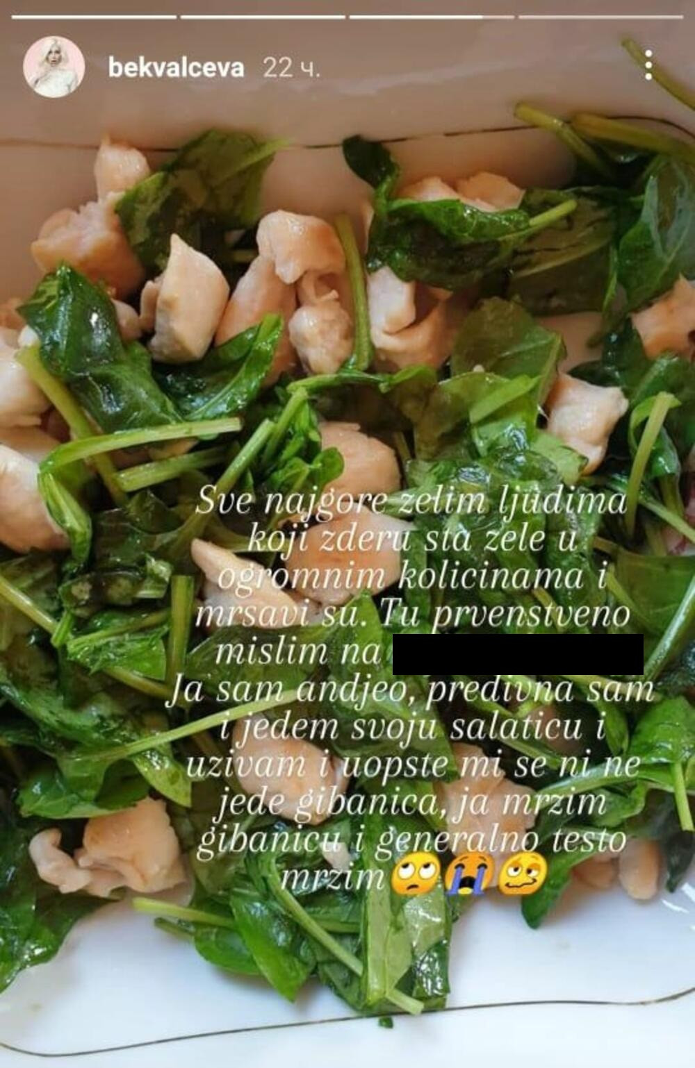 – Evo šta ona, moja mama, napravi kada smo kod nje i kada joj kažem da sam na specijalnoj ishrani! Kaže ona meni: „Nije poenta da ne jedeš kad nemaš šta da jedeš, već da ne jedeš čak i kada vruća gibanica stoji ispred tebe. To je karakter i volja”, napisala je Bekvalčeva u jednom storiju, ali nije se tu zaustavila.
