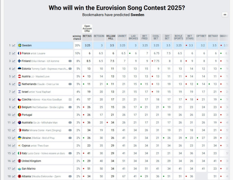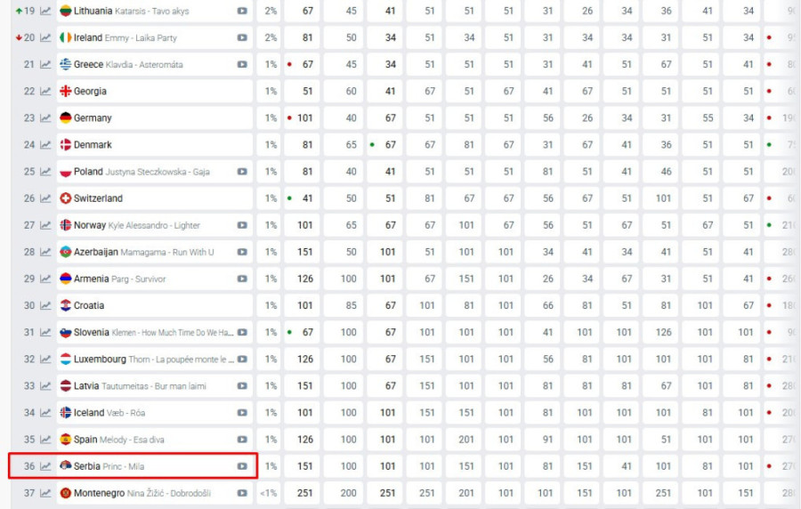 S druge strane, kada je u pitanju Srbija, za sada nam se ne piše dobro. Kladionice, poput korisnika društvenih mreža, ne smatraju da će Princ uspeti da se plasira u finale, a kada je u pitanju ukupan plasman, predviđaju nam pretposlednje, 36. mesto.