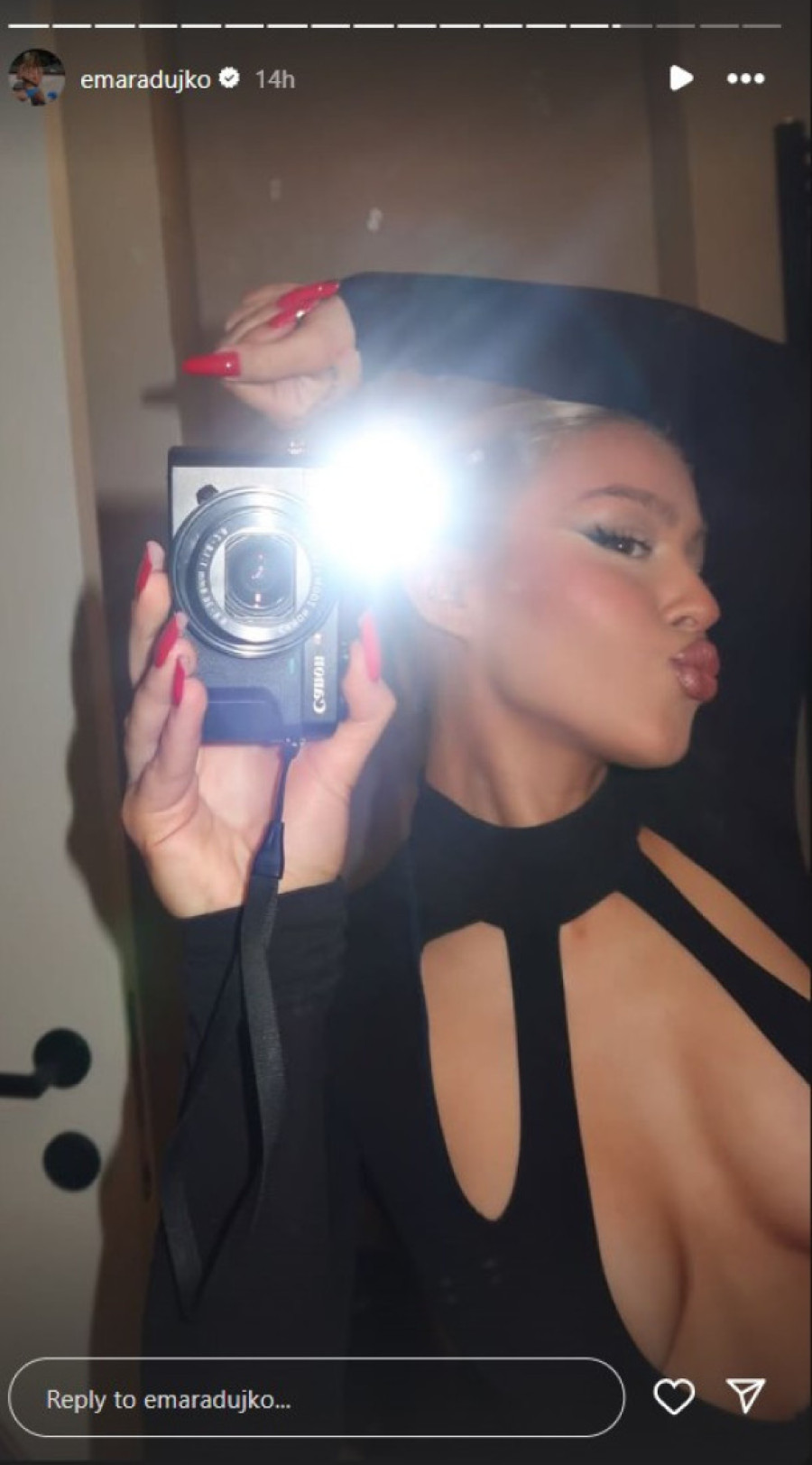 Ema je pozirala ispred ogledala, a svima je za oko zapao njen provokativni crni kombinezon sa velikim rezom i dubokim dekolteom. Na Instagramu je objavila niz fotografija, a mnogi fanovi su primetili da su njene grudi bile u prvom planu.