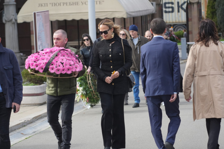 Marijana je bila sva u crnom - nosila je maramu oko vrata, dužu jaknu i pantalone, kao i naočare koje nije skidala, te duge, zlatne minđuše. Pored nje je išao muškarac koji je nosio venac od pink gerbera.