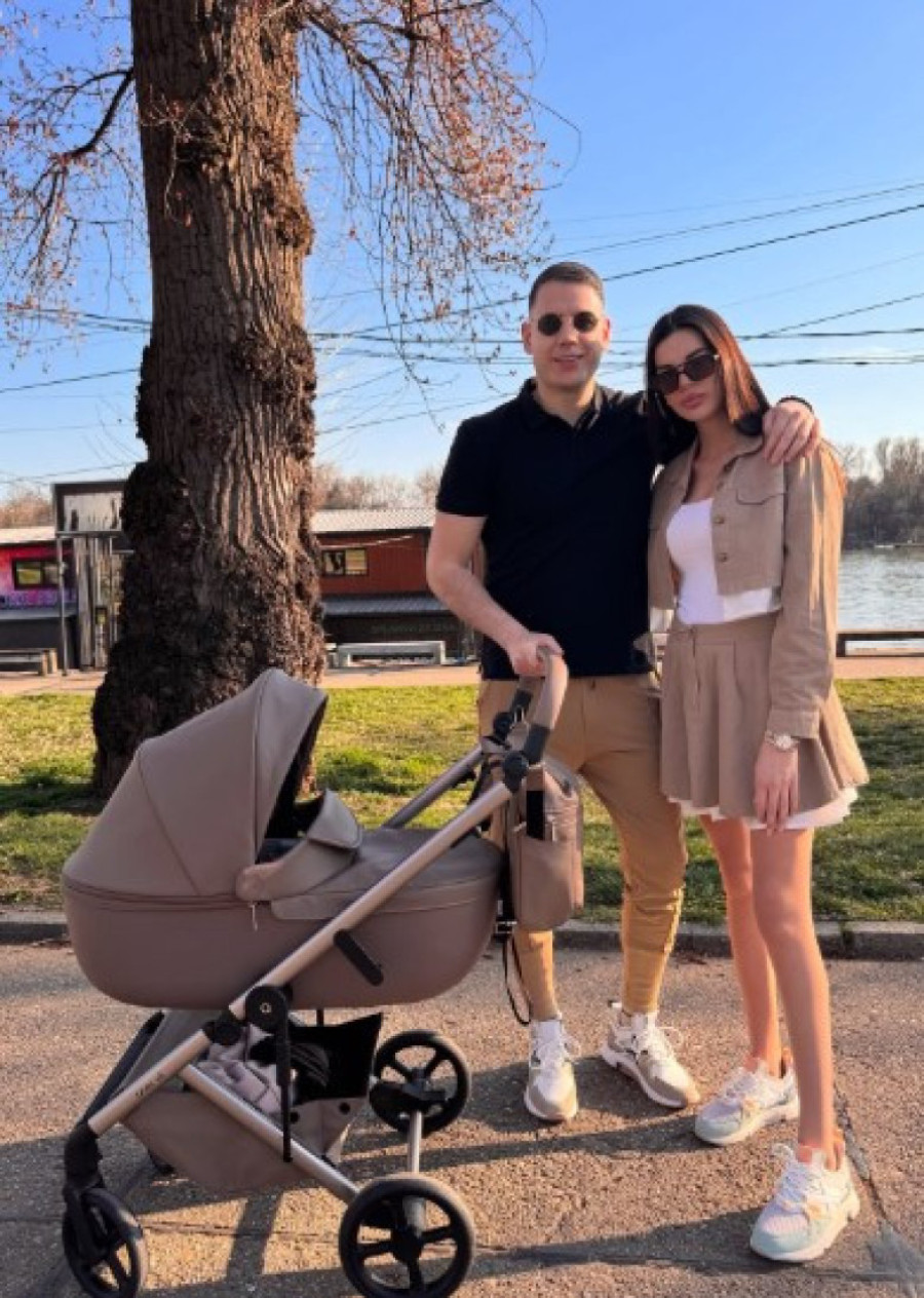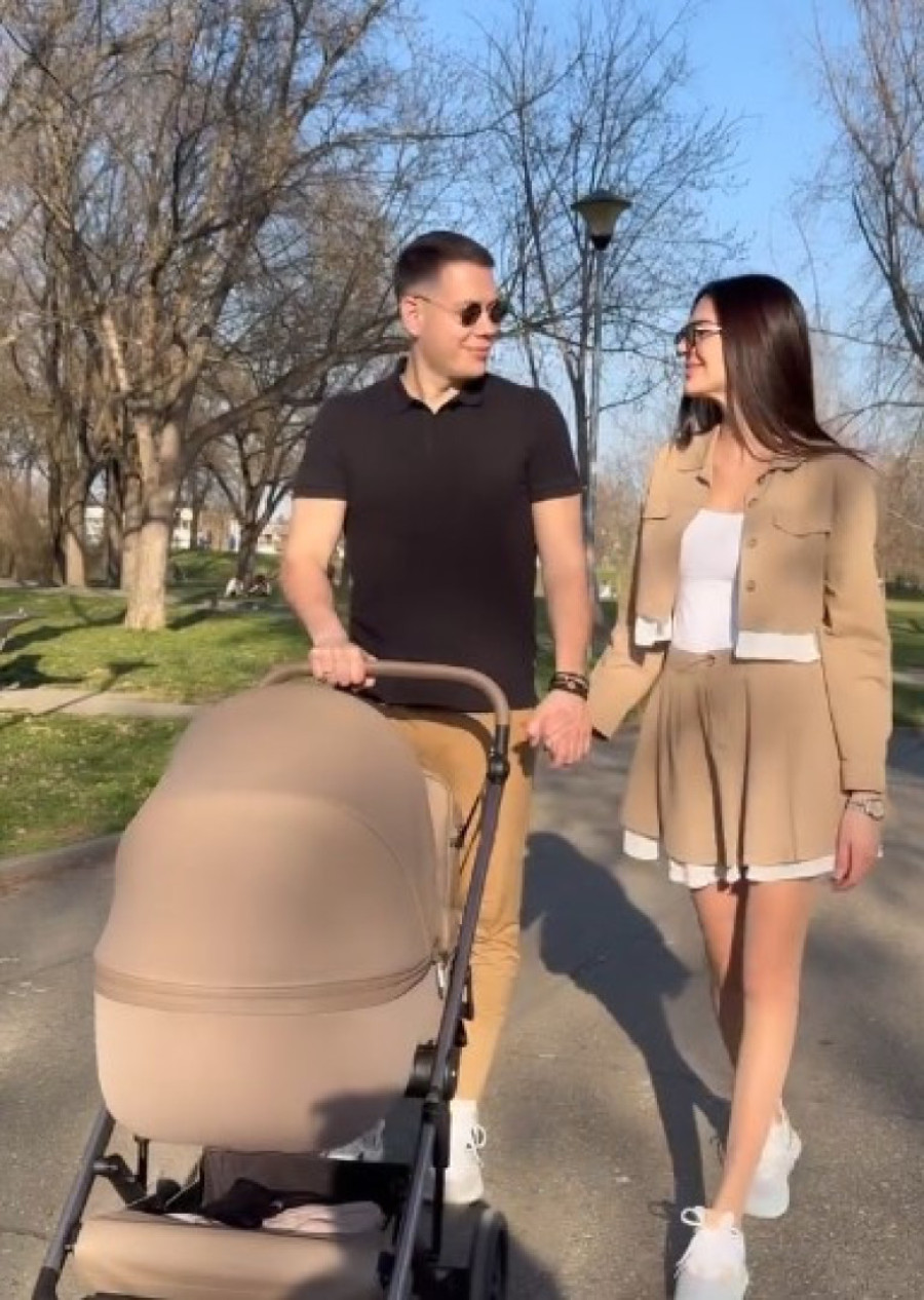 Za šetnju je odabrala mini suknju i jaknicu u istoj boji, dok je Bogdan bio u opuštenom, kežual izdanju, sa naočarima na licu, ponosno gurnuvši kolica u kojima je spavao mali Jakov.