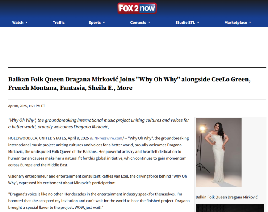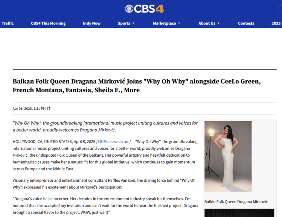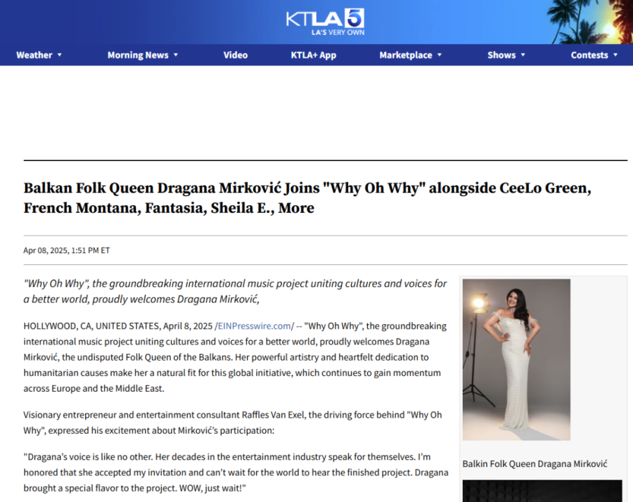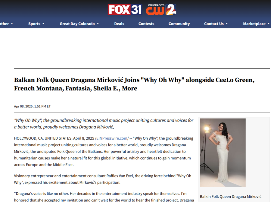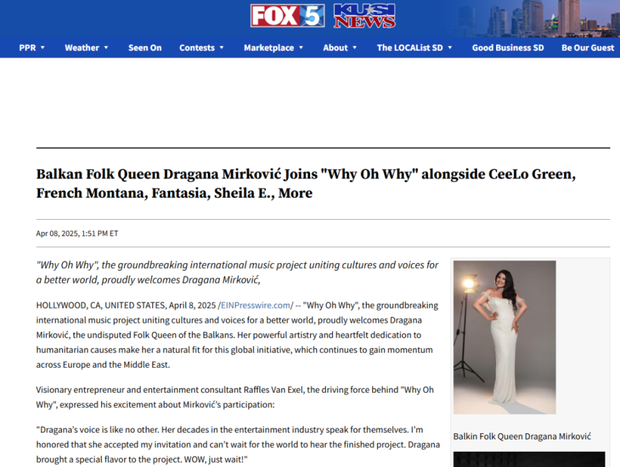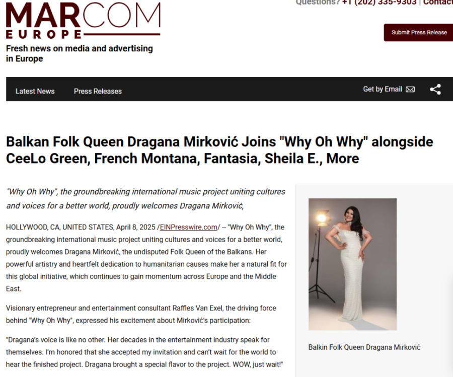 Na svim eminentnim portalima (FOX, KTLA5, KusiNews, CBS4, KRON4, MENAFN, FOX2now, Fox31, MARCOM, WIProud) danas je osvanuo naslov „Balkanska folk kraljica Dragana Mirković pridružila se Why Oh Why projektu". Vizionar preduzetnik i konsultant za zabavu Rafls Van Eksel, pokretač „Why Oh Why-a“, izrazio je uzbuđenje akonto Draganinog učešća, a čovek koji je zaslužan za to što je do saradnje došlo - njen je generalni menadžer, Dražen Damjanović.