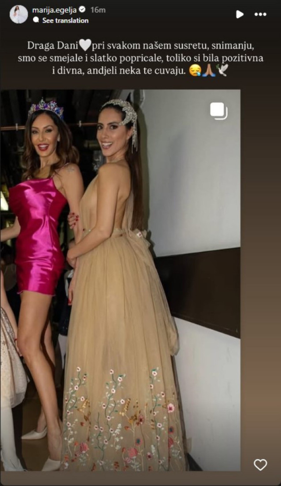 - Draga Dani, pri svakom našem susretu, snimanju smo se smejale i slatko popričale, toliko si bila pozitivna i divna. Anđeli neka te čuvaju - napisala je Marija.