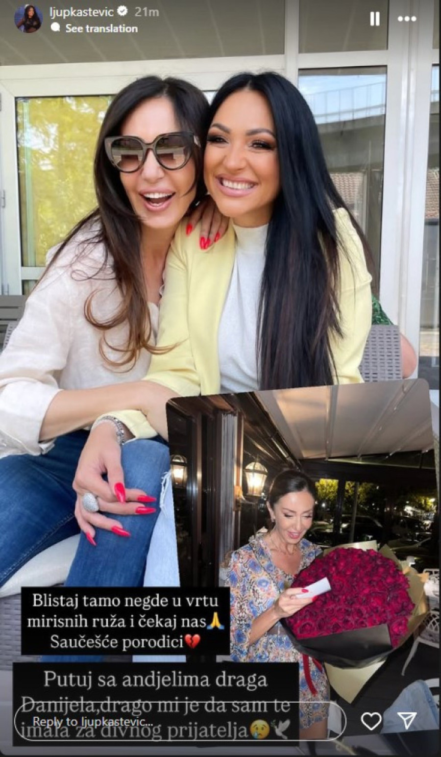 - Blistaj tamo negde u vrtu mirisnih ruža i čekaj nas. Saučešće porodici. Putuj sa anđelima, draga Danijela, drago mi je da sam te imala za divnog prijatelja - poručila je Ljupka.