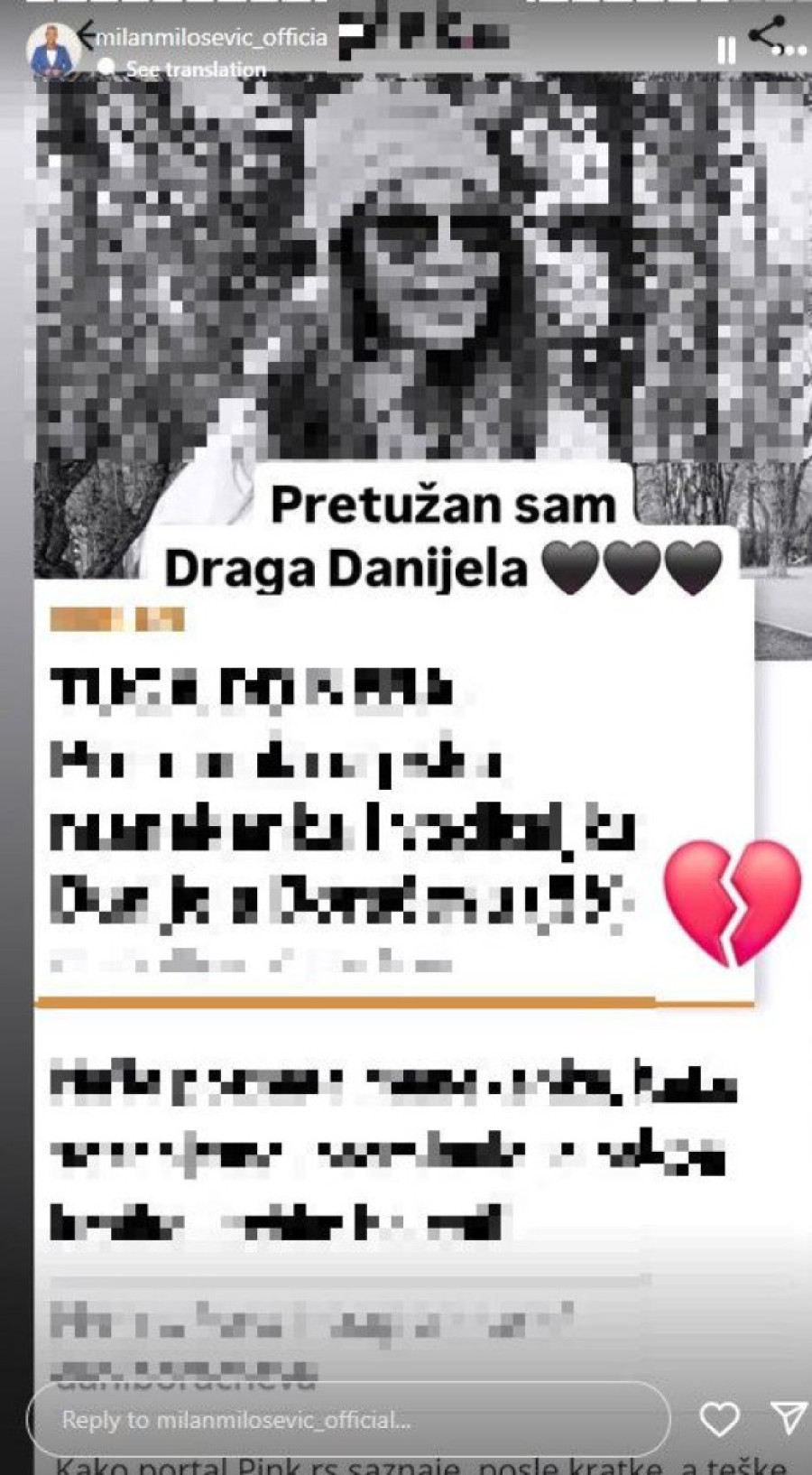 Ana Sević je podelila takođe Danielinu fotografiju i stavila emotikon slomljenog srca.