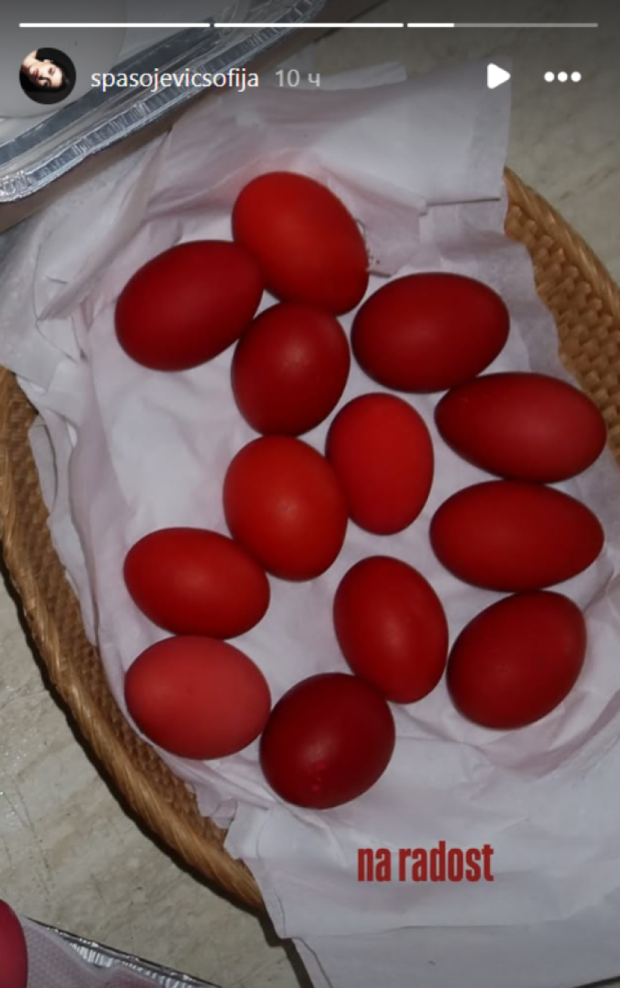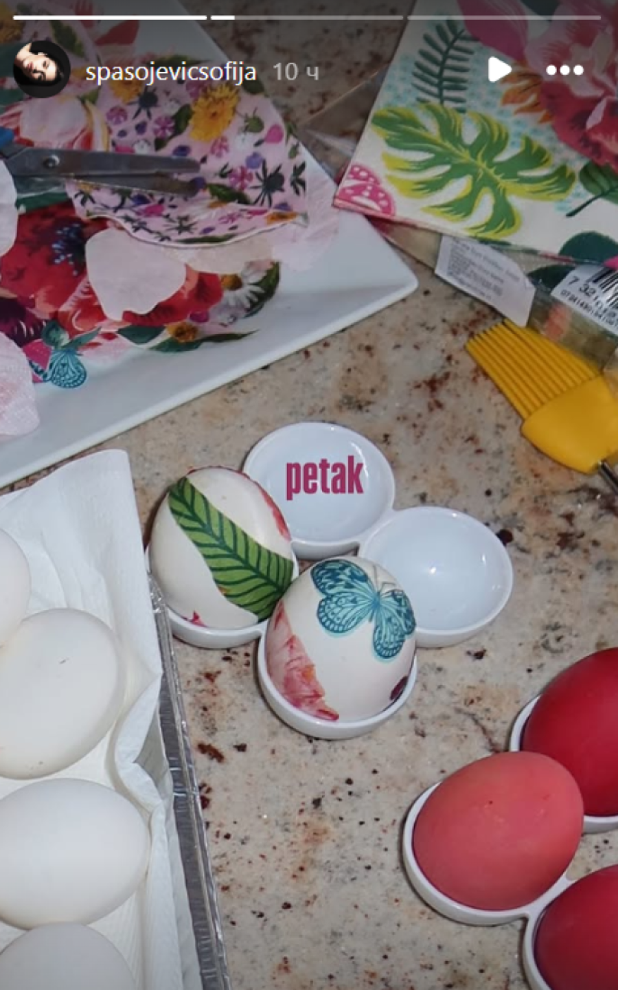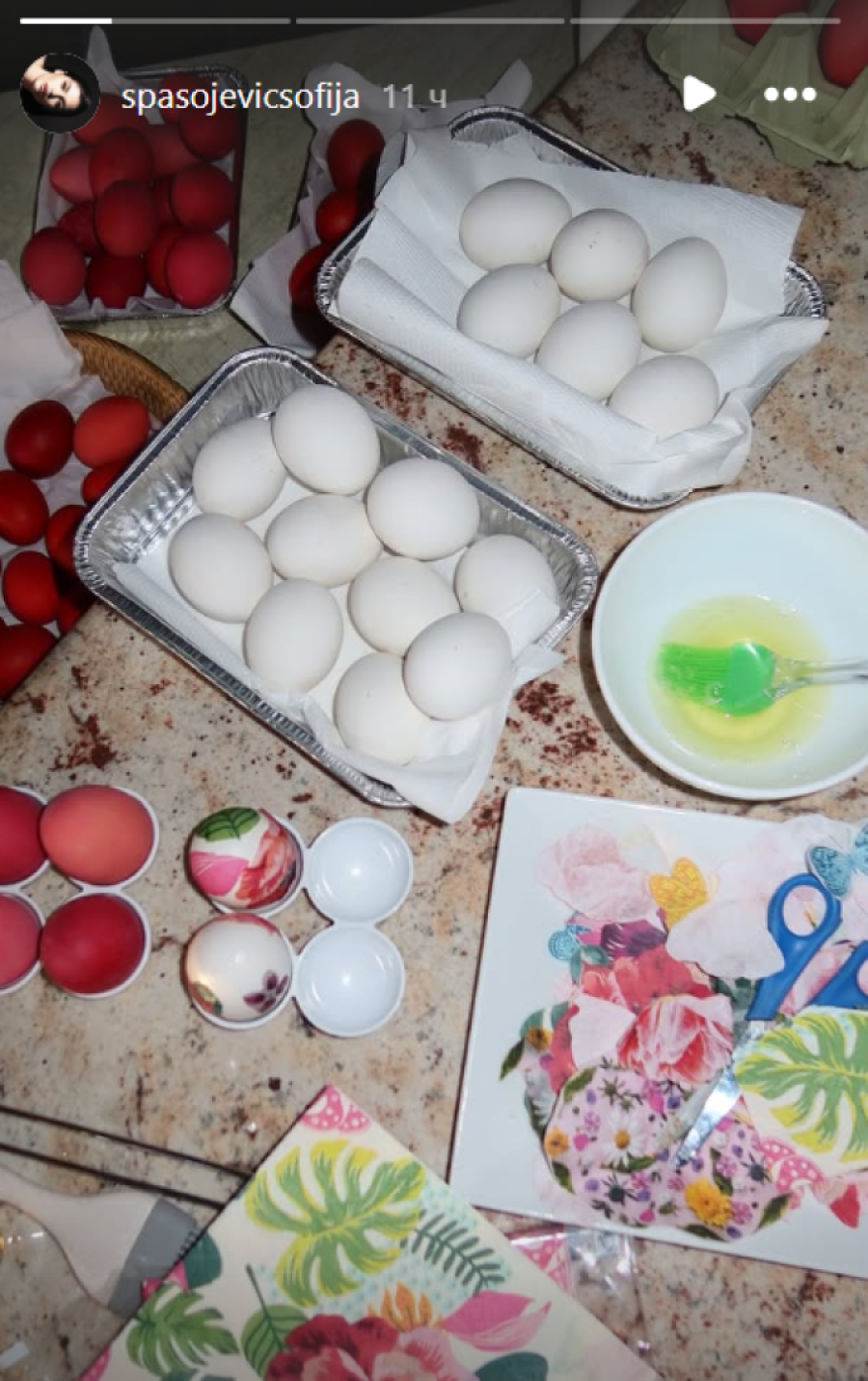 Uoči Uskrsa, Sofija je pokazala koliko je vešta domaćica. Na Veliki petak, svojim pratiocima na Instagramu pohvalila se farbanjem jaja. Jedna korpica bila je ispunjena crvenim jajima, dok je drugu dekorisala tehnikom dekupaž, sa nežnim cvetnim motivima na beloj podlozi.