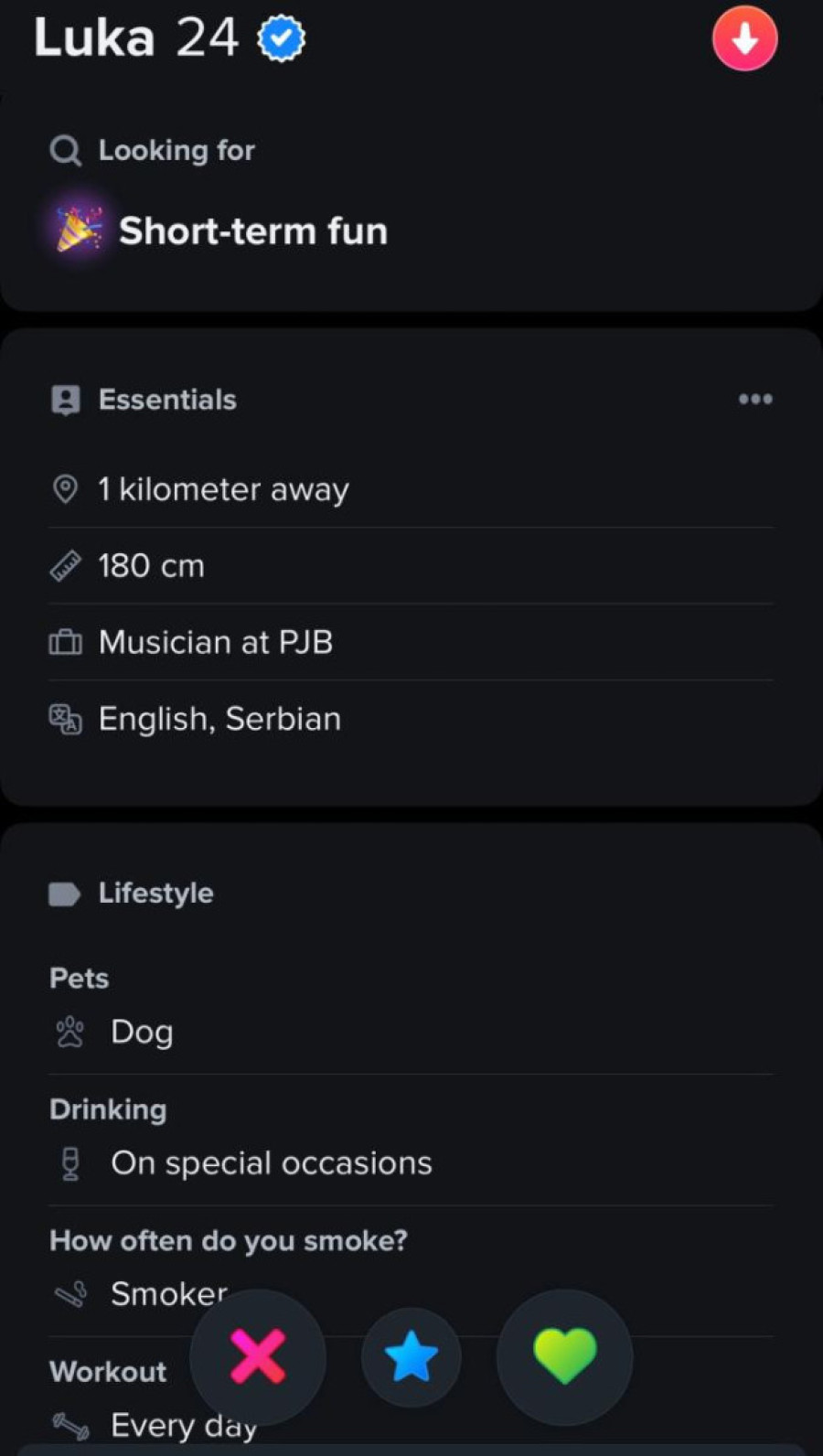 Pljugica, naime, očigledno ne planira da se skrasi, pa tako traži nekog za zabavu kratkog veka. Pored toga, piše mu da je visok 180 centimetara, da je muzičar, da konzumira alkohol u specijalnim prilikama, ali da je pušač, te da u teretanu ide svakog dana.