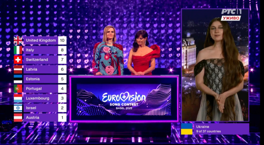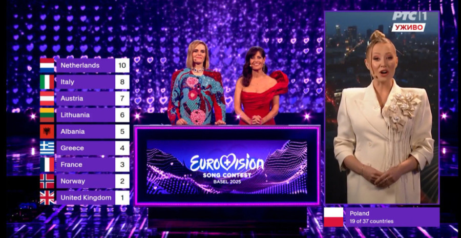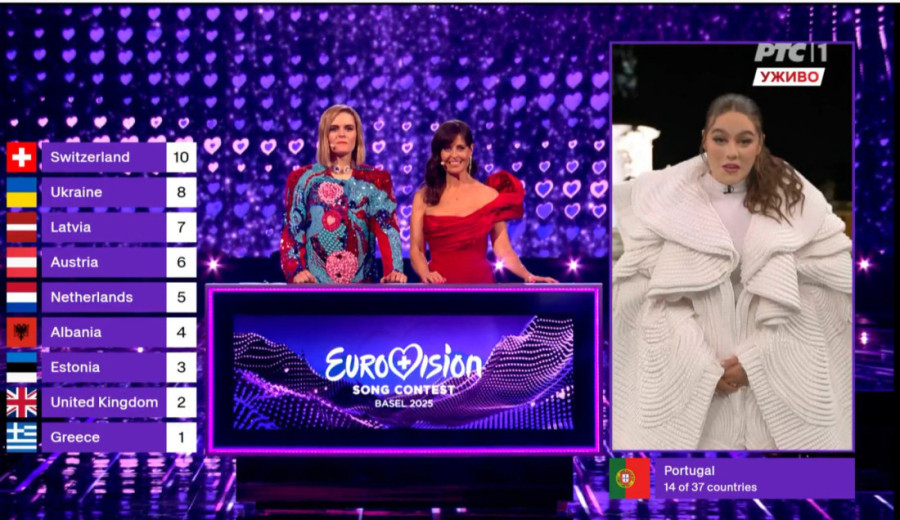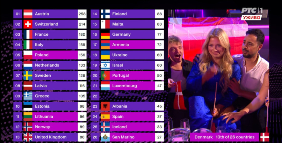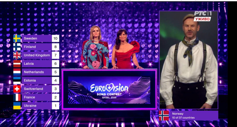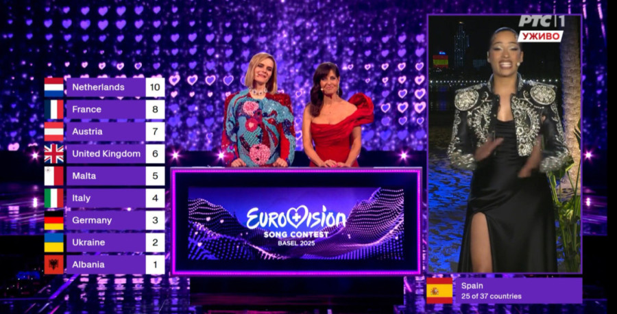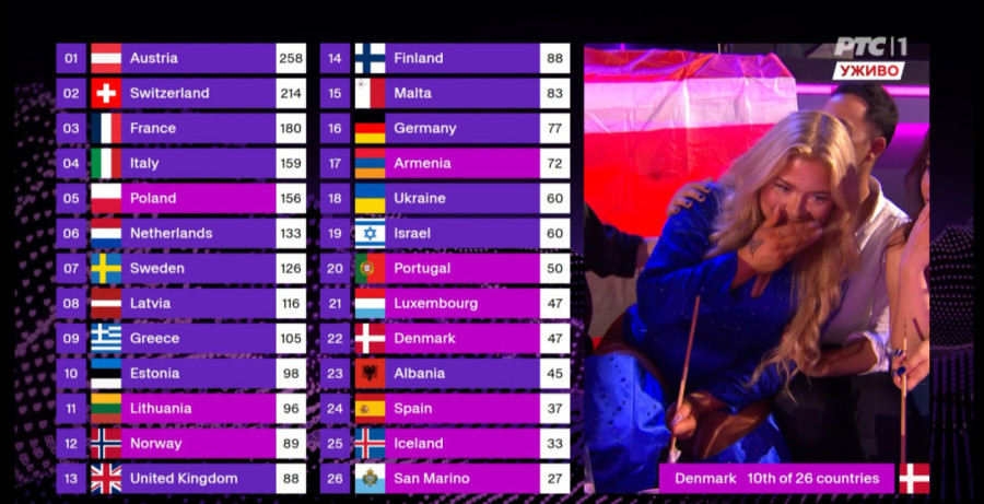 Dragana Kosjerina saopštila je glasove iz Srbije: Srbija je 8 poena dala Austriji, 10 Nemačkoj, a 12 poena Francuskoj.