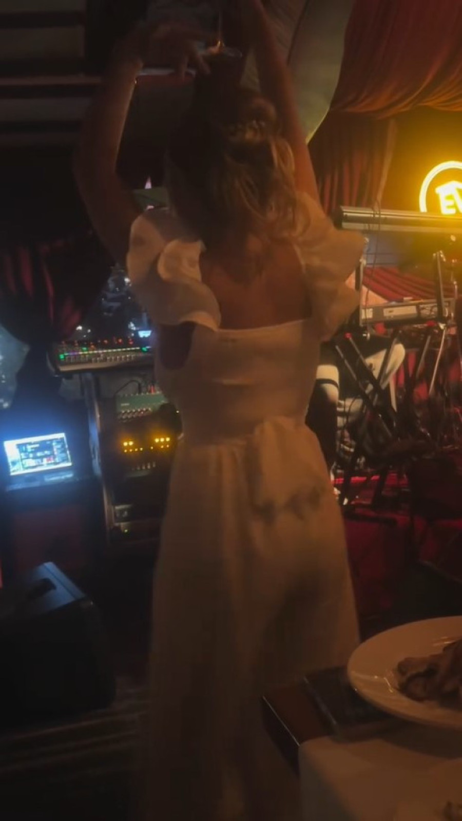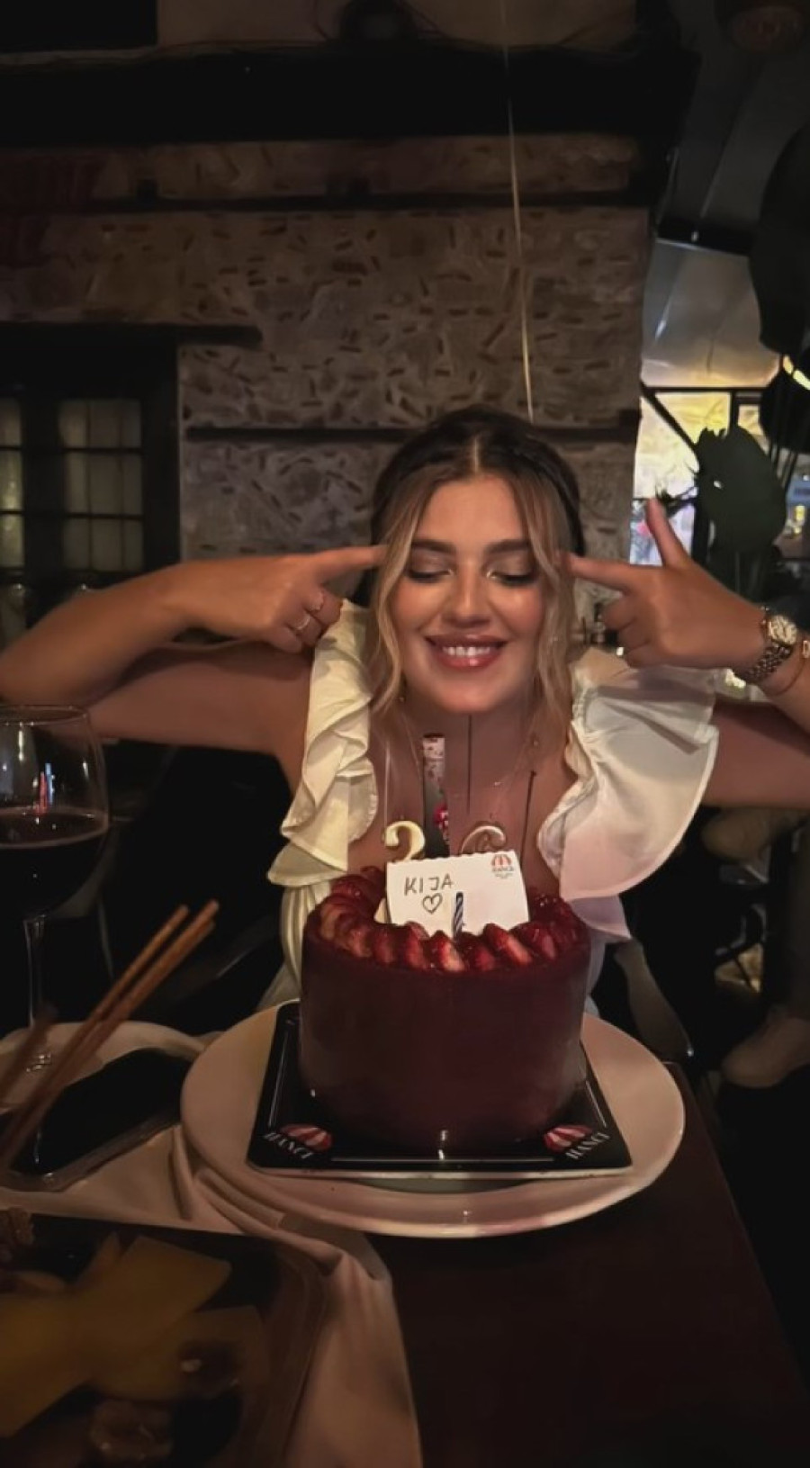 Kija je za ovu priliku odabrala elegantnu belu haljinu na bretele, sa dubokim dekolteom koji je privlačio pažnju svih prisutnih. Sa osmehom koji nije silazio sa lica, uživala je u svakom trenutku proslave.