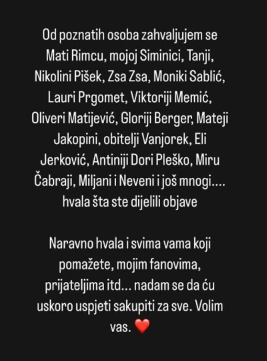 - Naravno hvala svima vama koji pomažete, mojim fanovima, prijateljima. Nadam se da ću se uskoro skupiti za sve. Volim vas - napisala je Ava.