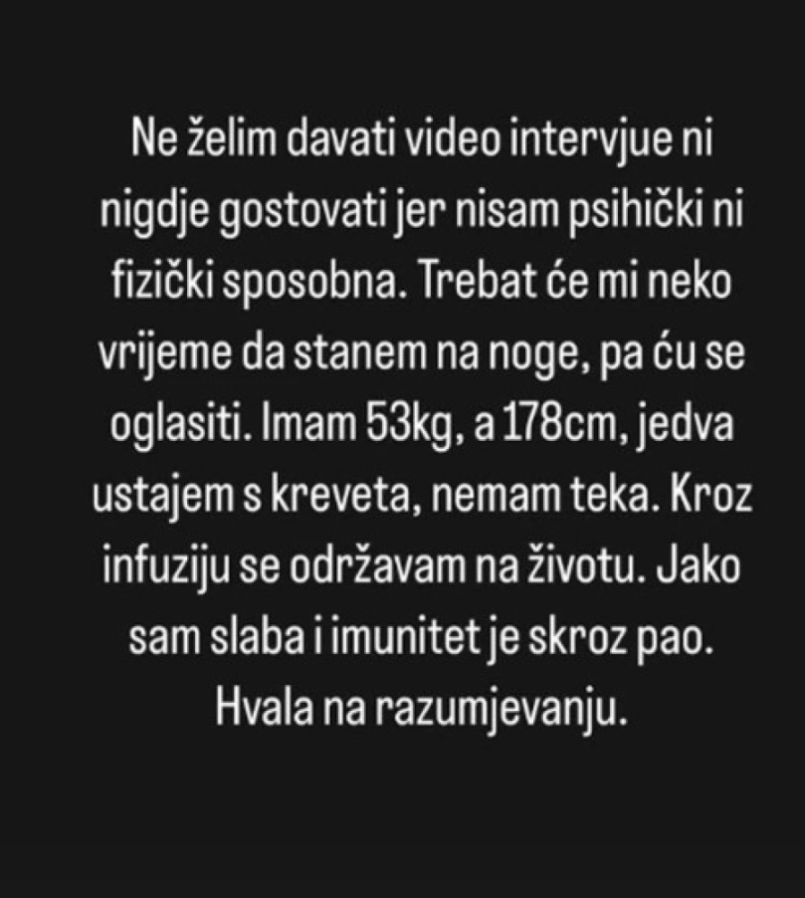 - Ne želim davati video intervjue, nisam psihički ni fizički sposobna. Trebaće mi neko vreme da stanem na noge, pa cu se oglasiti. Imam 53 kg, a 178cm, jedva ustajem s kreveta. Kroz infuziju se održavam u životu. Jako sam slaba i imunitet je skroz pao - napisala je ona na Instagramu, a potom je otkrila ko joj je sve pomogao.