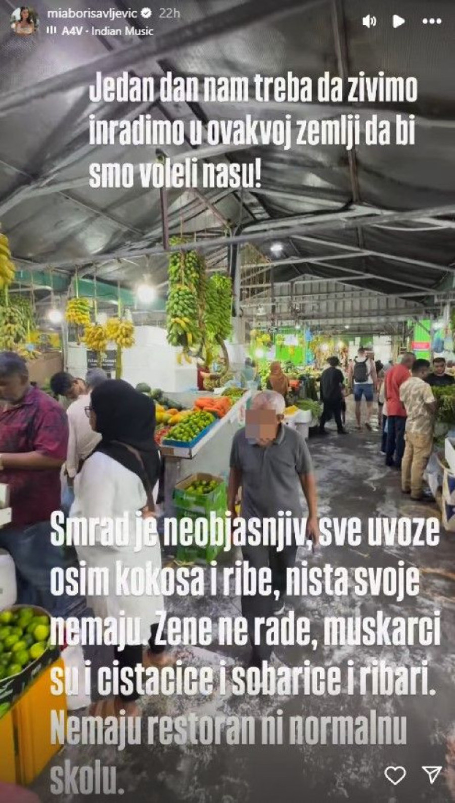 - Smrad je neobjašnjiv. Uvoze sve osim kokosa i ribe, ništa svoje nemaju. Žene ne rade, a muškarci su i sobarice i čistačice. Nemaju restoran, ni normalnu školu - pisala je Mia.