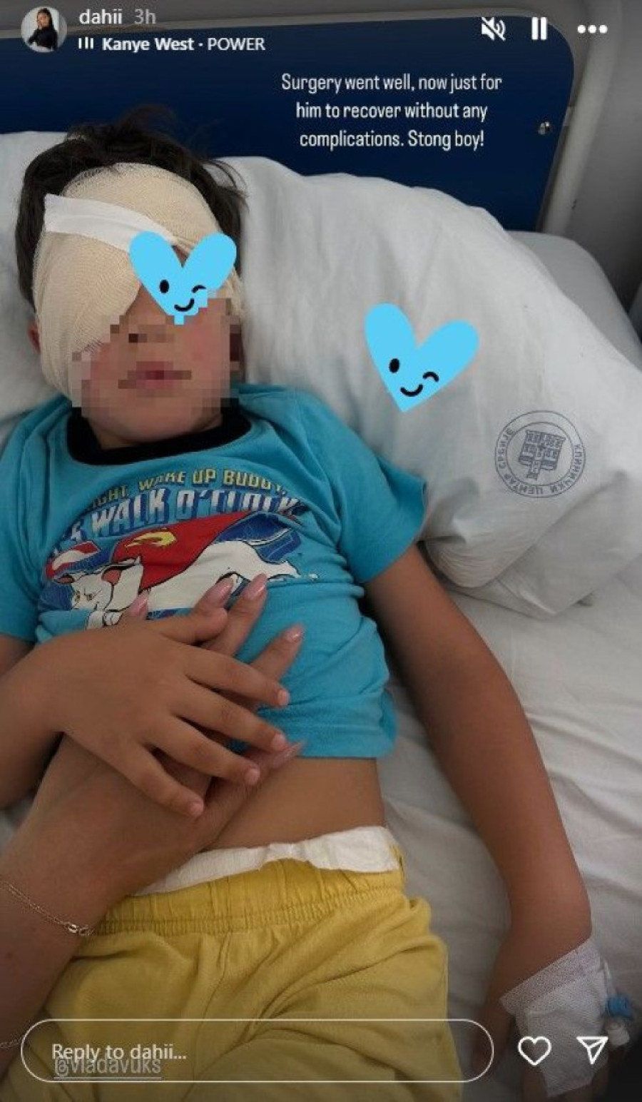 Ona je objavila i fotografiju sina iz bolničkog kreveta, sa zavojem na glavi, preko oka, a mališan je držao mamu za ruku.
