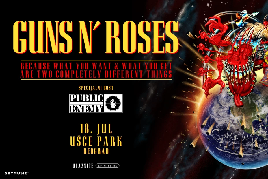Bend koji je redefinisao pojam rock'n'rolla 80-ih i 90-ih godina, poznat po svom divljem duhu, neponovljivoj energiji i pesmama koje su obeležile generacije, nastupiće pred beogradskom publikom u punoj snazi – predvođen legendarnim Axlom Roseom, uz podršku Slasha i Duffa McKagana. Kao predgrupa nastupiće pioniri hip – hopa, legendarni Public Enemy.