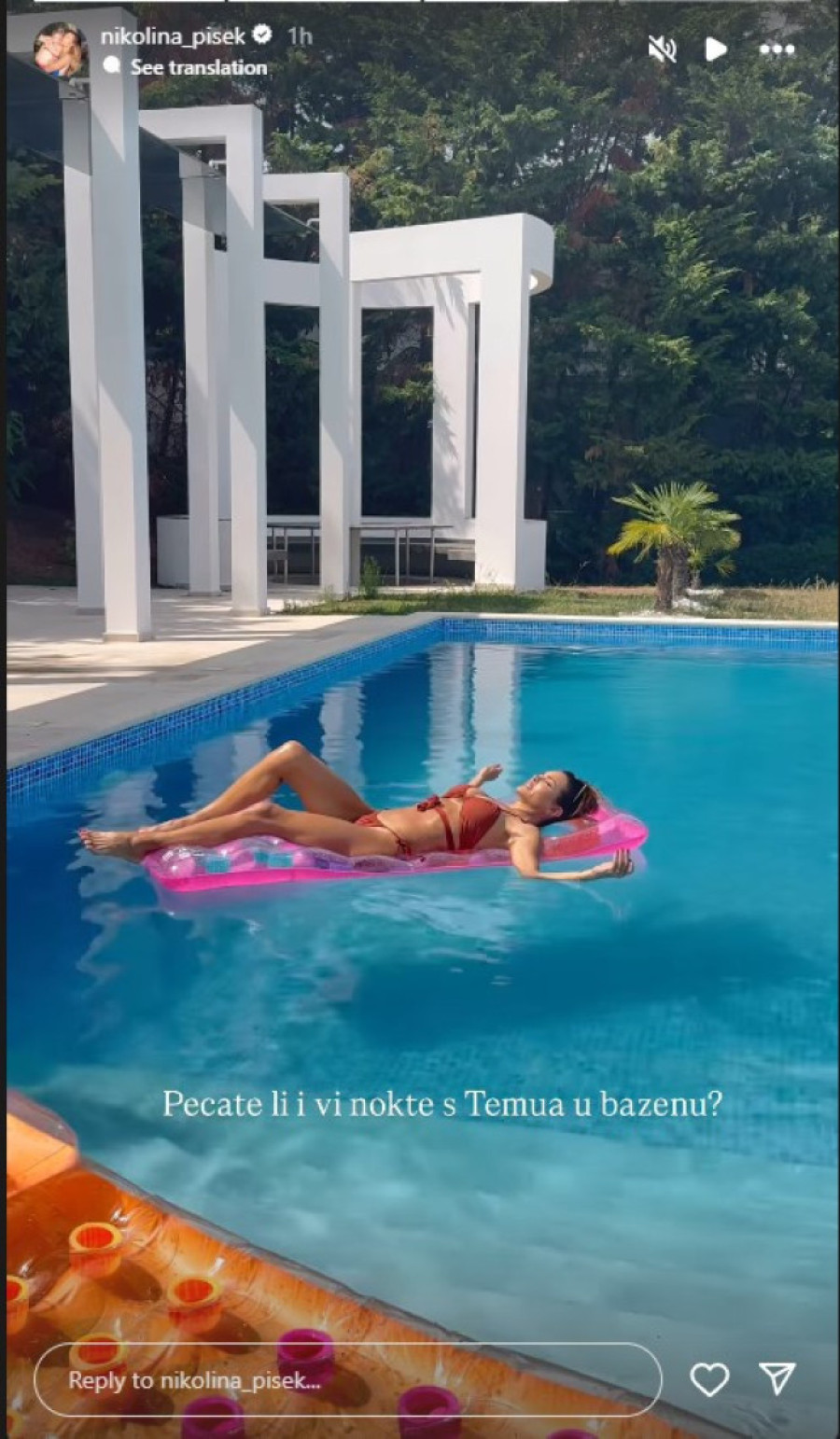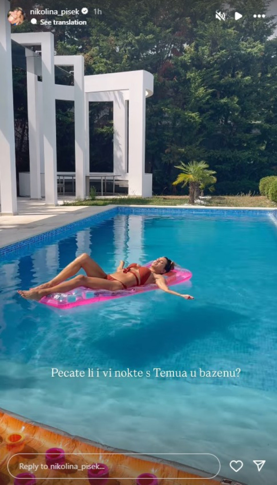 Nikolina je, što je očekivano, pokazala i zavidnu figuru u kupaćem kostimu, dok je ležala na dušeku na naduvavanje i brčkala ruke u vodi.