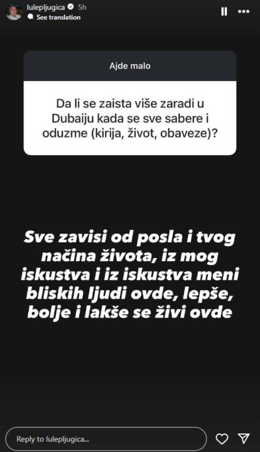 - Sve zavisi od posla i tvog načina života, iz mog iskustva i iz iskustva meni bliskih ljudi ovde - lepše, bolje i lakše se živi ovde - rekao je Pljugica na svom Instagram storiju.