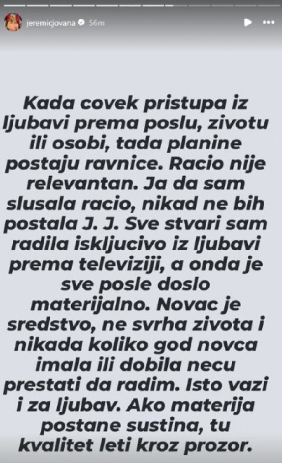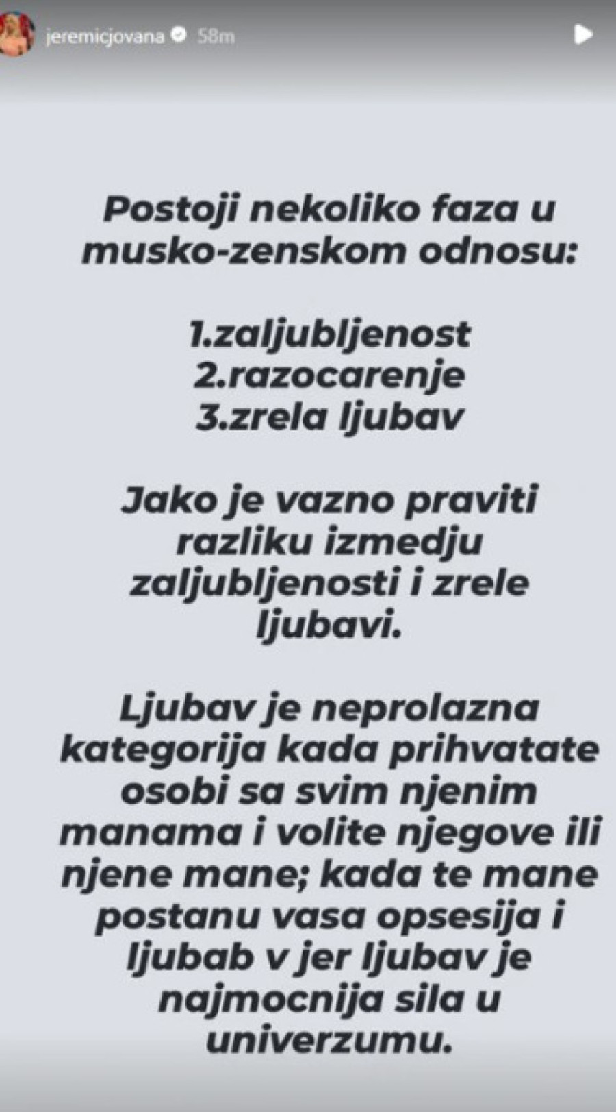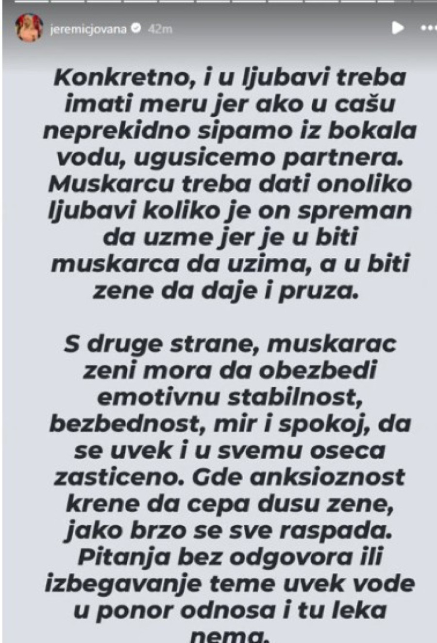 Međutim, iako nisu govorili javno o detaljima svog raskida, Jovana je skoro zaintrigirala jednom svojom objavom, te i pokrenula spekulacije da ista možda govori baš o njihovom odnosu.