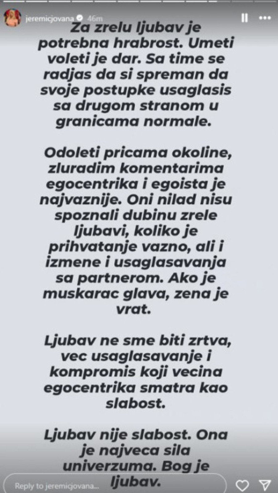 - Ljubav ne sme biti žrtva, već usaglašavanje i kompromis koji većina egocetrika smatra slabošću. Ljubav nije slabost. Ona je najveća sila univerzuma. Bog je ljubav - naglasila je između ostalog, pa pokrenula spekulacije da "priča" o njenoj vezi s biznismenom.